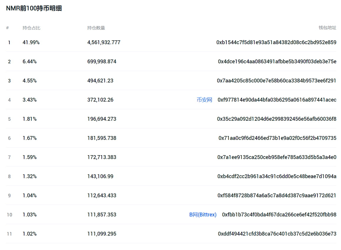 Emitido por primera vez el 21 de febrero de 2017, el suministro máximo es de 11.000.000 NMR y la tasa de circulación es del 53,53%. El precio actual de la moneda es de 13 dólares estadounidenses y el más alto de la historia fue de 168 dólares estadounidenses en 2017. Si lo miras bien. De esta manera, también ha caído un 90%. Después de tantos años, no he subido y no se ha encontrado la asignación. Mirando las 100 principales direcciones de tenencia de divisas, todavía hay bastantes ballenas gigantes. , y todos son científicos. Por lo tanto, los inversores minoristas aún deben ser cautelosos.