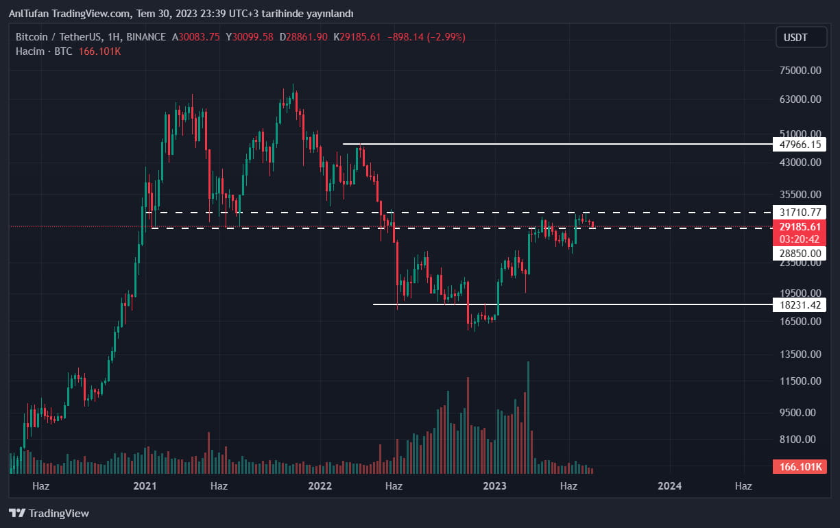 Lider kripto para birimi Bitcoin (BTC), son dönemde çok kritik seviyelerde yer alıyor. BTC halen 28.800 – 31.700 dolar direncini aşamamış durumda.