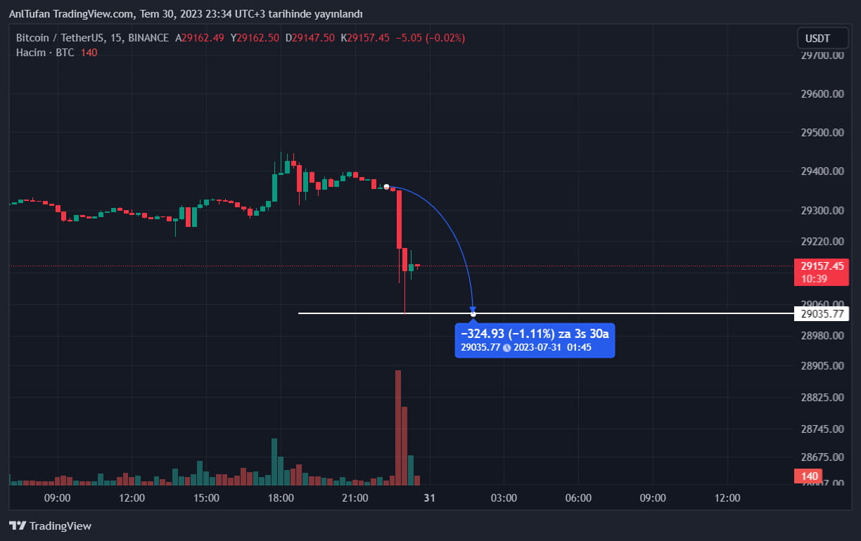 Haftalık kapanış öncesinde satış baskısı ile karşı karşıya kalan Bitcoin, kısa bir süre içerisinde 29.035 dolar seviyelerine geriledi.