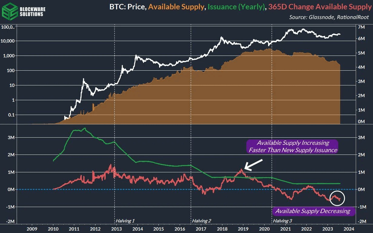La cuenta regresiva realmente está en marcha en este momento, ya que estamos a menos de un año de diferencia del próximo, y posiblemente el más importante, Bitcoin Halving en abril de 2024. Por lo tanto, obviamente es bastante interesante comparar ahora nuestra situación actual con los tiempos anteriores a la anterior. Reducciones a la mitad, ya que esto puede hacernos comprender la magnitud de la próxima reducción a la mitad. Mientras lo hacemos, no deberíamos mirar solo algunas travesuras de TA o gráficos de precios, que predicen $btc 100k, sino algo mucho más importante...