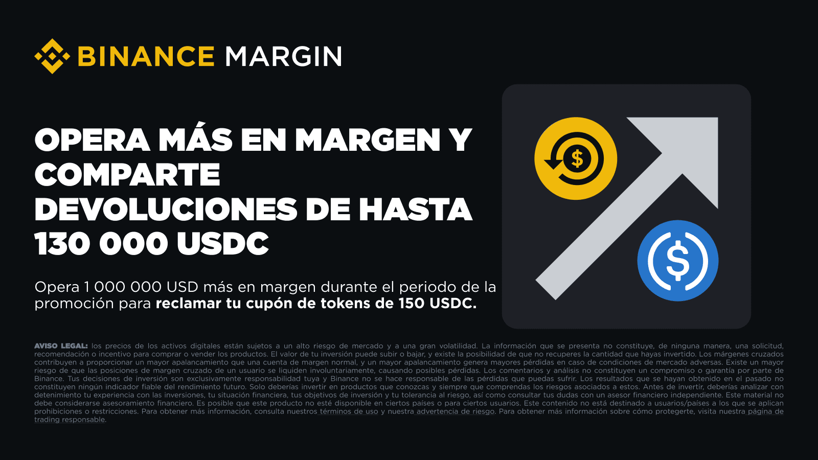 Binance Margin se complace de anunciar una promoción de devolución de los intereses para los usuarios comunes y VIP 1-6. Los usuarios que cumplan los requisitos y aumenten su volumen de trading de márgenes en cualquier producto de margen durante el periodo de la promoción podrán compartir un pool de recompensas de 130 000 USDC en cupones de tokens.