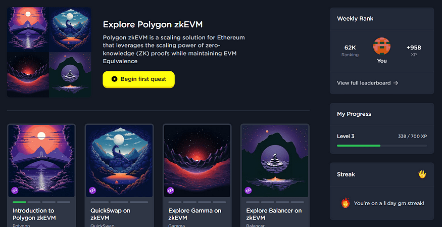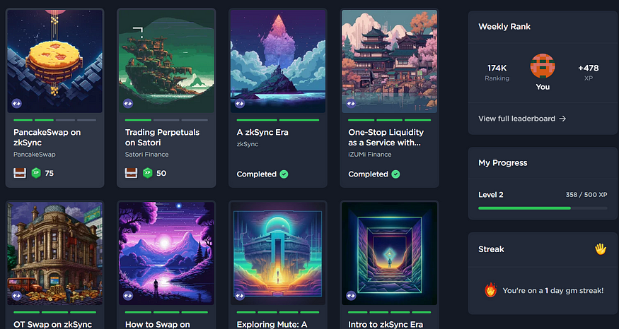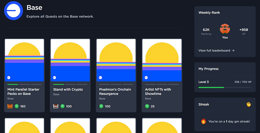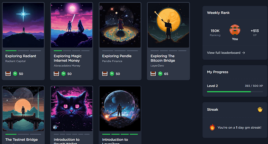相较于其他同类的平台,Layer3 我觉得也比较适合新手,因为它里面的任务主要是借助游戏化的方式,让你能够慢慢体验 Web3 和各种链上的交互操作,同时它结合了成就系统,让你有一种连续完成任务冲关的感觉。