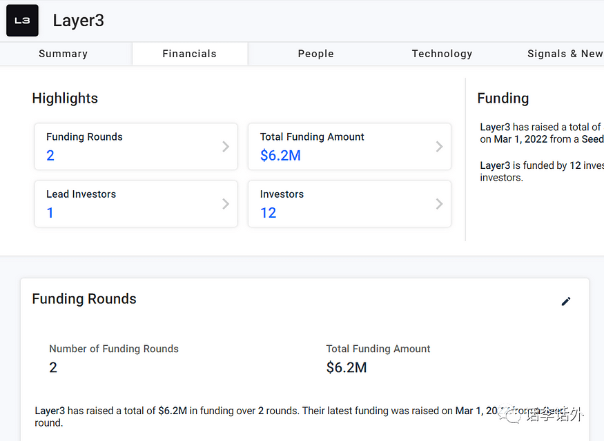 截止目前,Layer3 已经获得了两轮融资,累计融资额度为 620 万美元,投资方包括了Lattice Capital、Third Prime、Mirana Ventures、Lattice Capital、ParaFi Capital等。如下图所示。