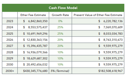 “The value assigned to ether is more easily modeled following the network’s shift to proof-of-stake. Demand for block space can be measured via transaction fees. These fees are both burned or passed on to validators, thereby accruing value for ether holders.