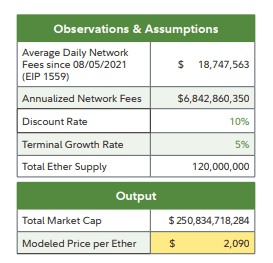 In a new report titled ‘Ethereum Investment Thesis’, Fidelity Digital Assets says that at the current Ethereum supply of around 120 million and annualized network fees of over $6.8 billion, the modeled price of ETH when a discounted cash flow model is applied is around $2,090 – around 28% above the current price.