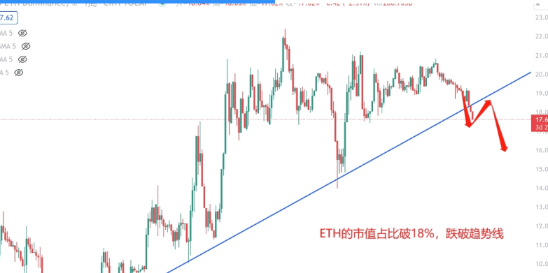 作为山寨币的代表和龙头,ETH的市值占比不断在压缩,同时跌破了上涨趋势线,当前数值为17.61%,ETH什么时候触底呢?难道在坎昆升级之前就这样疲软下去了?!