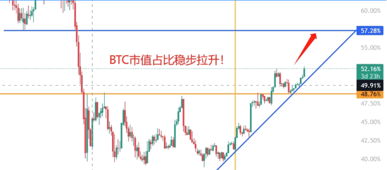 相比ETH,比特币的市值占比在突破一直沿着上涨趋势线稳步上升,当前数值已经达到52%,下个目标是多少呢?