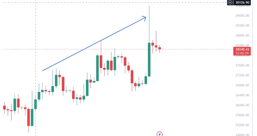 比特币冲高到3万点筹码密集成交区,并形成了较长的上影线,说明上方有极大的抛压盘也有极多的做空者,最终收线在前高28500下方位置,下一步需要考验的是28000点的支撑有效性