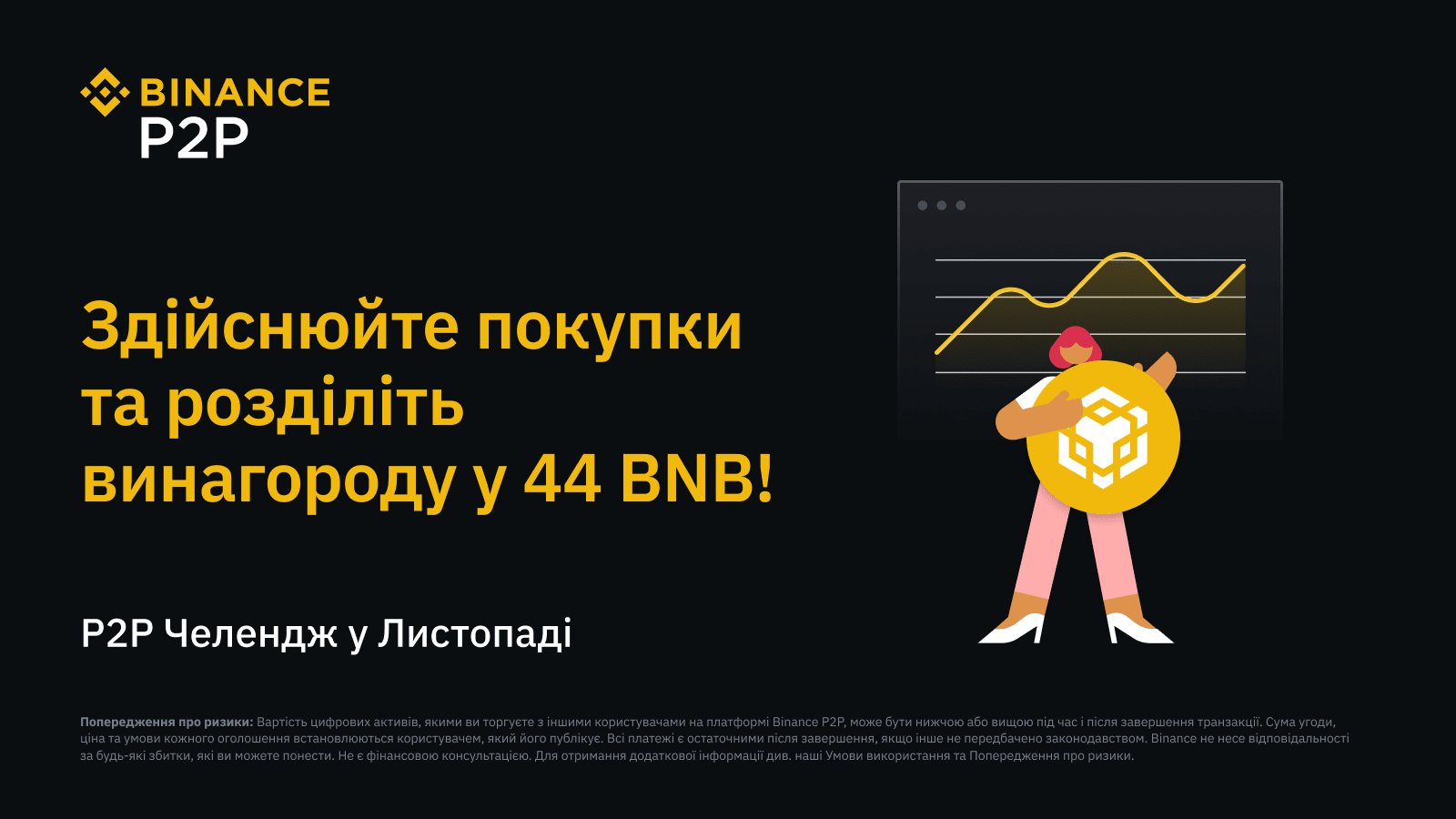 Binance P2P з радістю оголошує акцію для всіх користувачів Binance P2P! Користувачі, які підтвердять свою участь і здійснюватимуть угоди на Binance P2P відповідно до вимог протягом періоду промоакції, отримають частку від загального призового пулу в розмірі 44 BNB у токен-ваучерах.