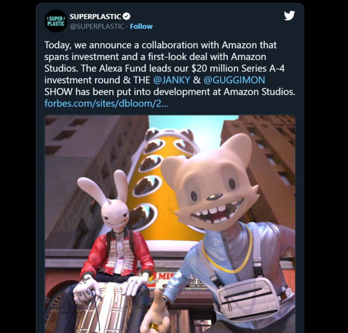 据《福布斯》的首次报道,据说这笔投资将资助开发一个名为“The Janky & Guggimon Show”的新 Prime Video 原创系列,该系列以 Superplastic 的两位最著名的虚拟名人为主角。