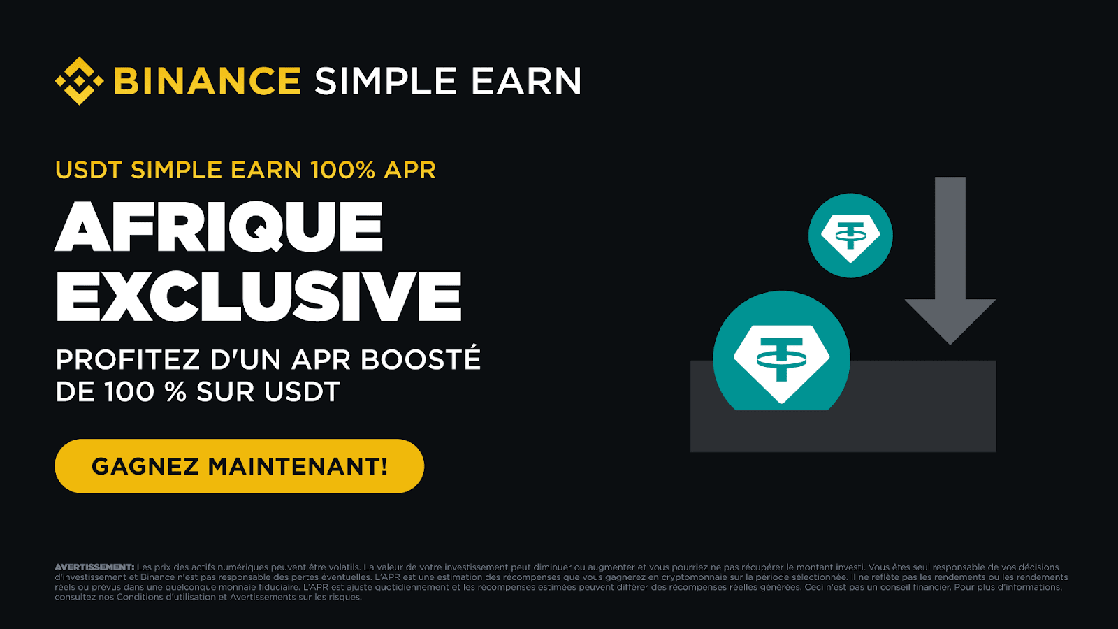 Binance lance une promotion exclusive pour notre communauté africaine ! Les nouveaux utilisateurs de Binance Simple Earn qui souscrivent à USDT sur les produits verrouillés Simple Earn peuvent profiter d’un APR boosté de 100 % sur USDT.
