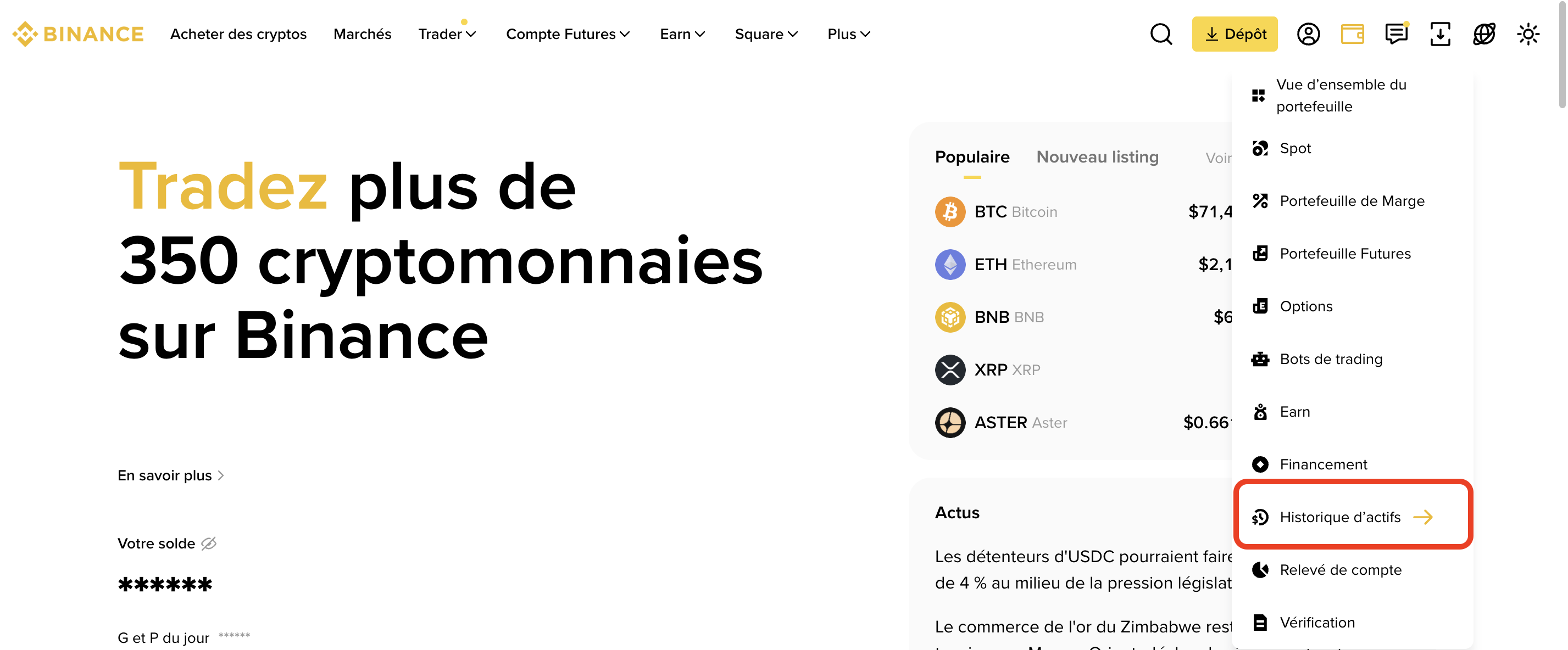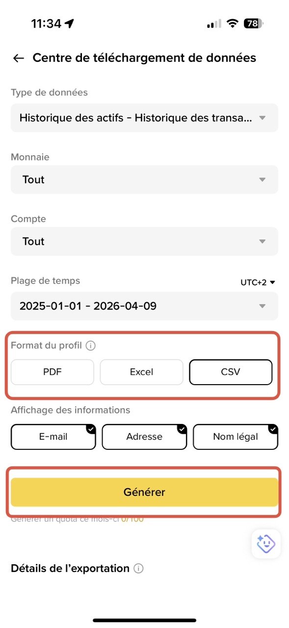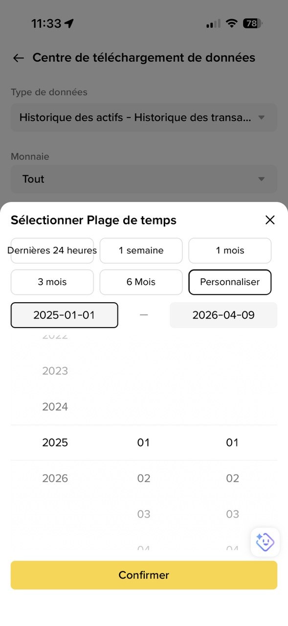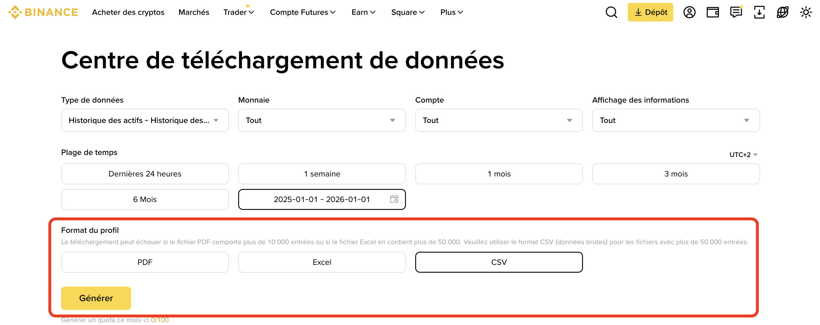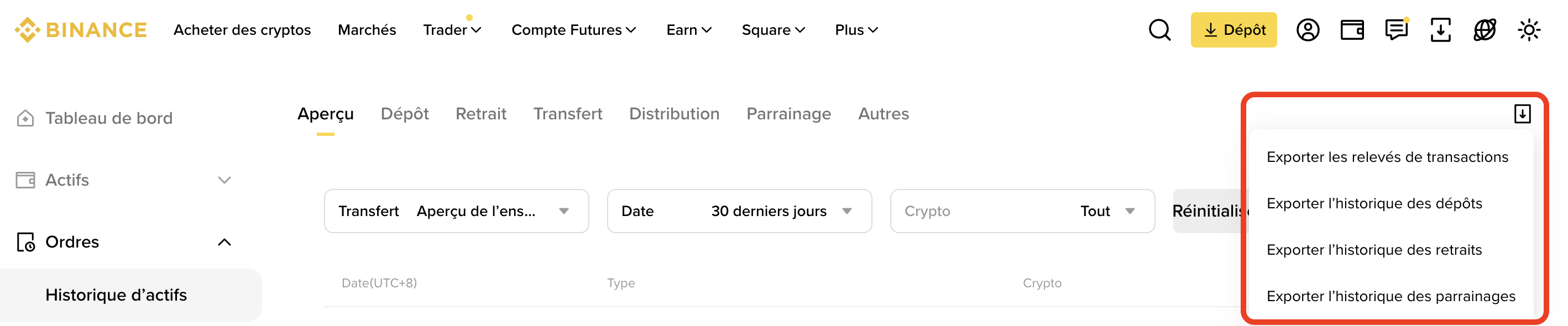 Pour faciliter votre déclaration, vous pouvez exporter l'historique complet de vos transactions depuis votre compte Binance. Ce fichier vous permettra de reconstituer l'ensemble de vos opérations d'achat et de vente pour calculer vos plus-values, ou de l'importer dans un outil fiscal tiers de votre choix.