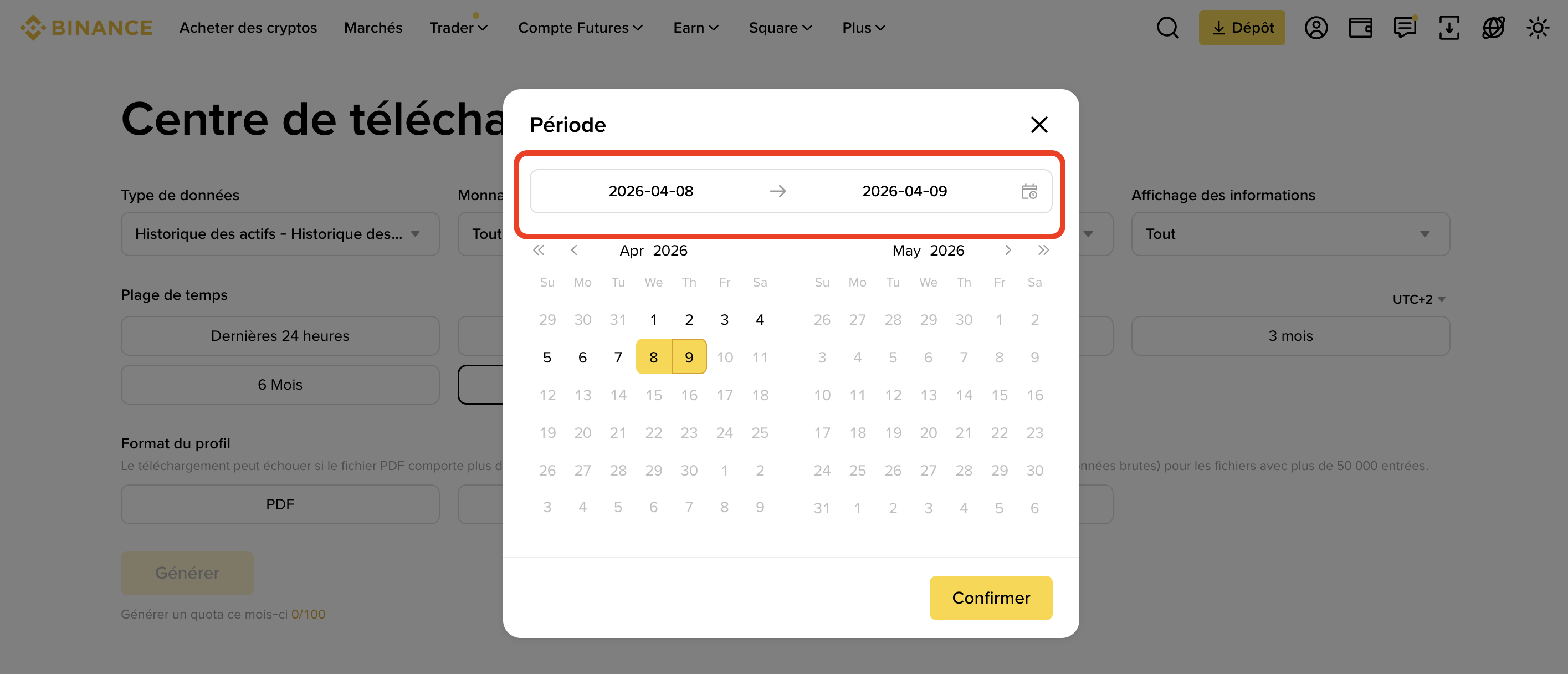 Toutefois, la période disponible peut varier en fonction du type de rapport et de la date de création de votre compte. Si vous avez besoin d'informations portant sur une période spécifique qui ne figure pas parmi les options proposées, vous pouvez contacter l'équipe support Binance pour vérifier les possibilités disponibles.