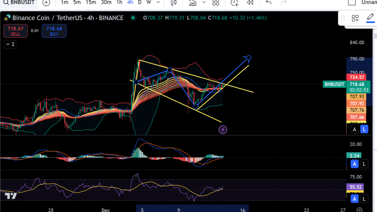 Ici, nous pouvons voir que le BNB est haussier. Nous pouvons également voir un modèle de drapeau haussier. Bollinger