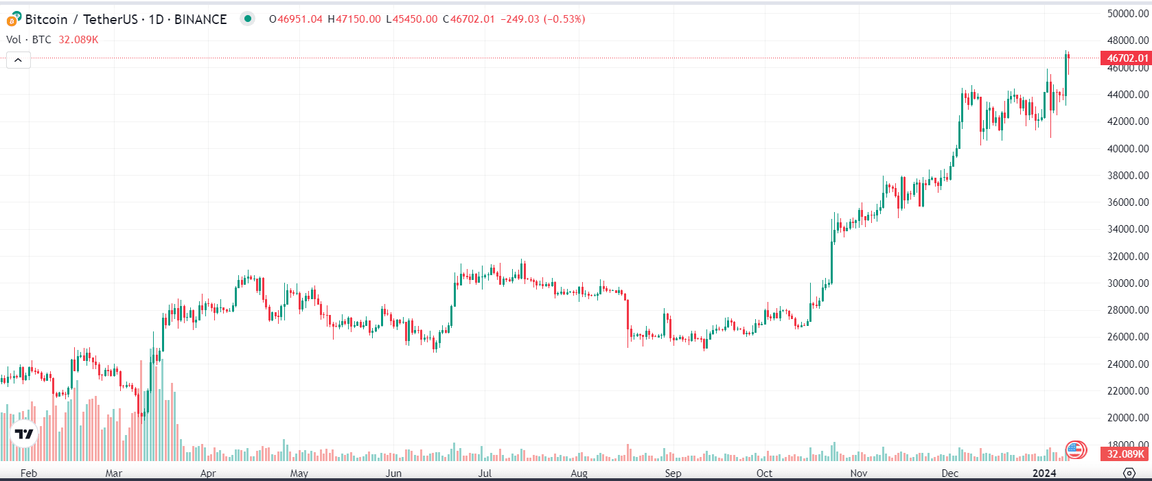 Les tickers Bitcoin BTC en baisse de 46 825 $ se préparent à répéter un mouvement graphique haussier rare, absent au cours des huit dernières années.