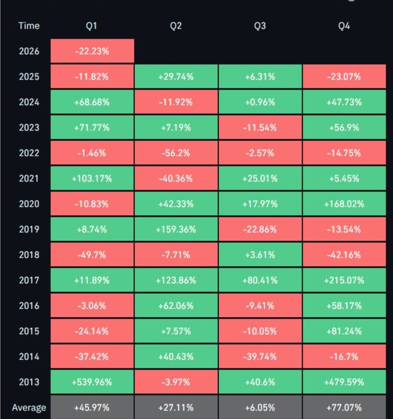 Le Bitcoin n'a eu que deux fois des premiers trimestres perdants consécutifs, et les deux fois étaient pendant de lourds marchés baissiers en 2018 et à nouveau en 2022