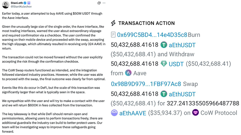 Regardez cette image à gauche, le fondateur d'Aave, Stani, est même sorti pour expliquer : le système a en fait déclenché un avertissement rouge, lui demandant de confirmer, mais ce gars a cliqué par accident sur son téléphone.