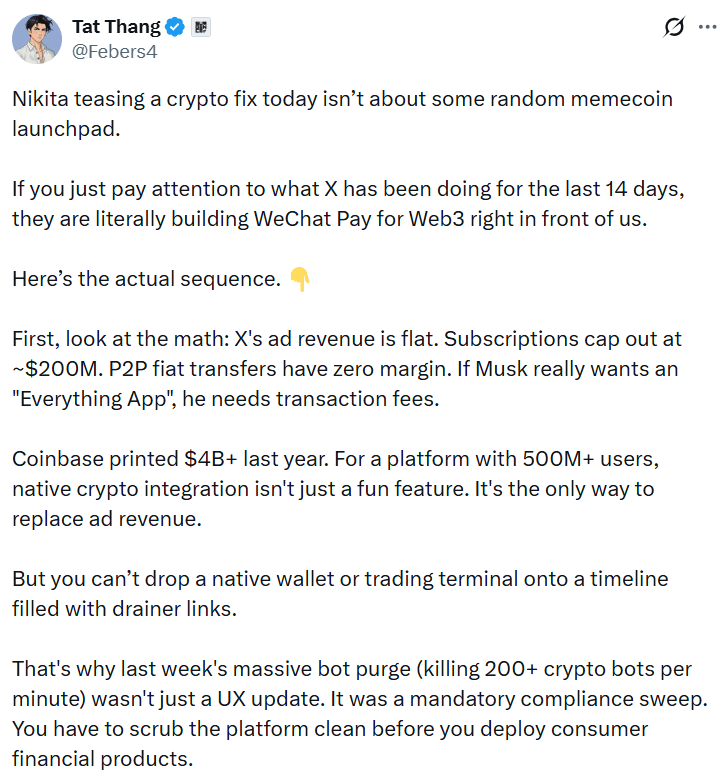 Tat Thang, un partenaire de la plateforme de prévision Polymarket, a suggéré que X essaie de construire un équivalent Web3 de WeChat Pay, une super application chinoise qui permet aux utilisateurs de faire des paiements mobiles et de transférer de l'argent entre contacts.