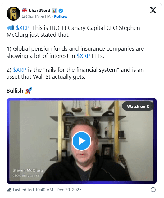 En partageant la vidéo, ChartNerd a placé les commentaires de McClurg dans le contexte du positionnement à long terme de XRP. Il a souligné que les fonds de pension mondiaux et les compagnies d'assurance montrent un intérêt pour les ETF XRP. La reconnaissance par Wall Street du rôle de l'actif est haussière.
