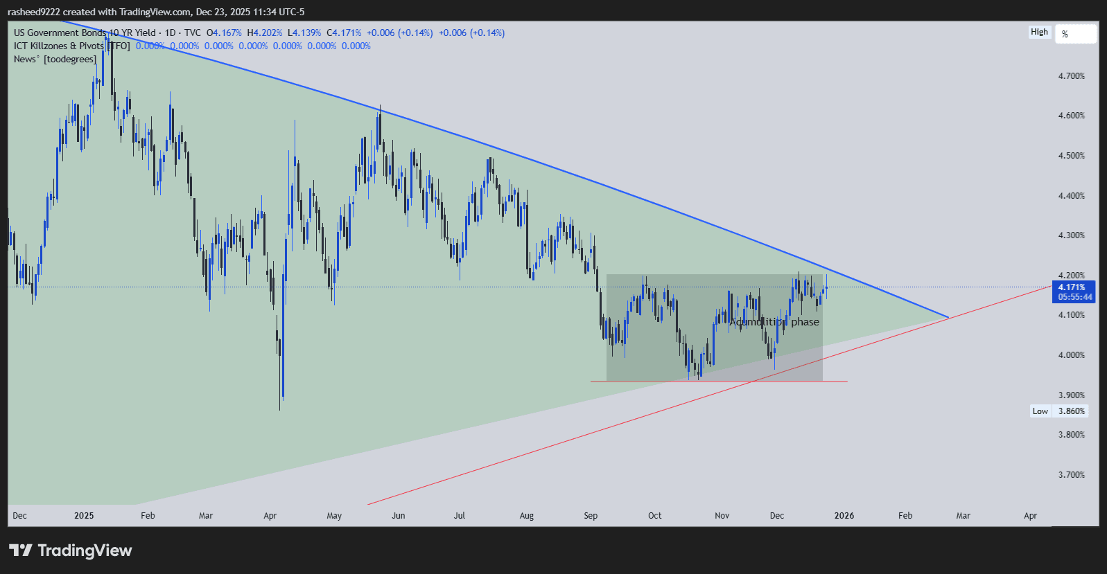 Les indicateurs d'inflation (CPI/Core PCE) continuent de se refroidir, et le ton de la Fed reste accommodant et dépendant des données, avec un taux de politique autour de 4,5 %. Cela maintient les rendements obligataires sous pression à la baisse.
