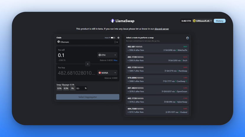 ▪️LlamaSwap développé par DefiLlama : swap.defillama.com
