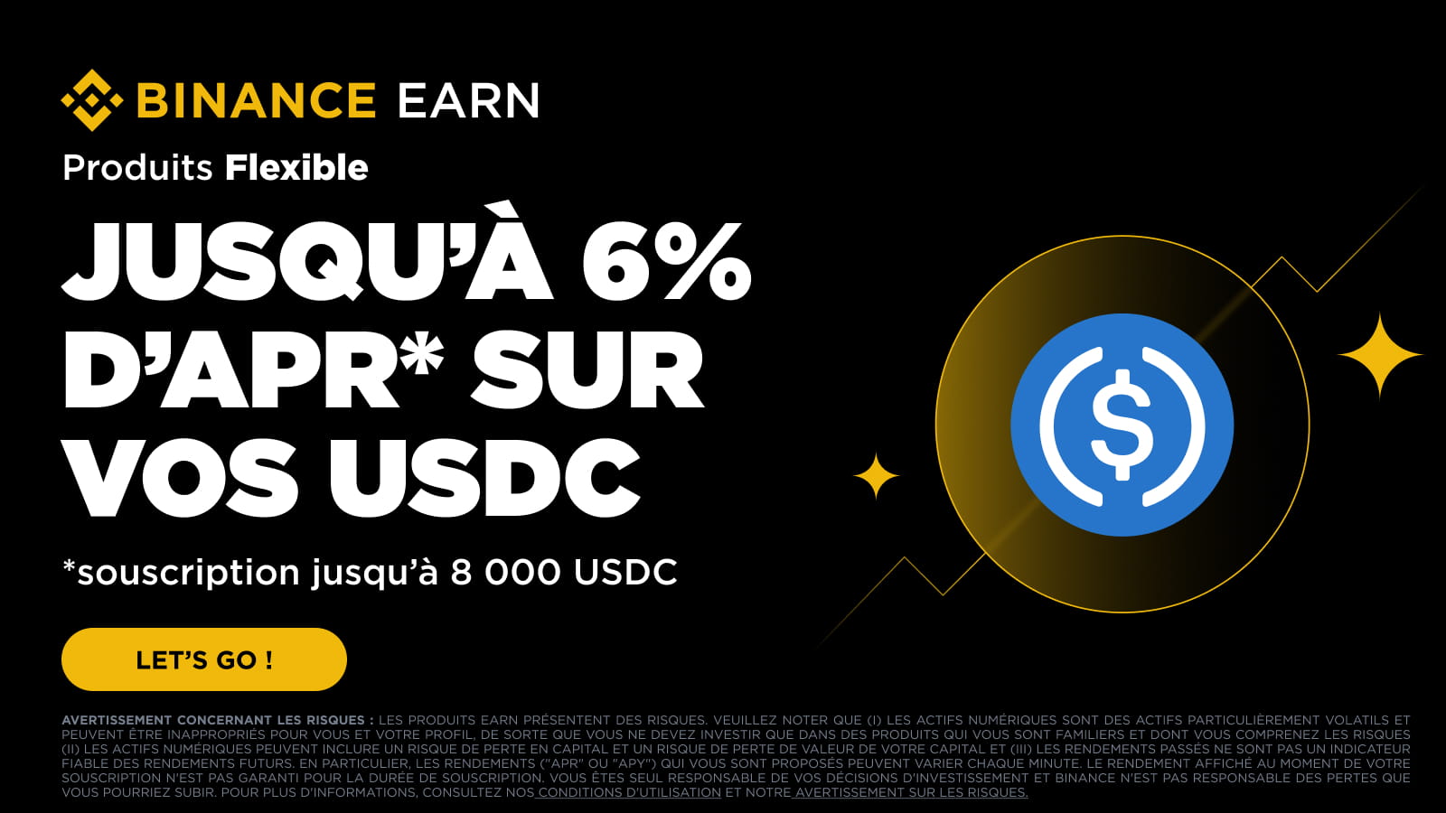 Les produits Earn présentent des risques. Veuillez noter que (i) les actifs numériques sont des actifs particulièrement volatils et peuvent être inappropriés pour vous et votre profil, de sorte que vous ne devez investir que dans des produits qui vous sont familiers et dont vous comprenez les risques (ii) les actifs numériques peuvent inclure un risque de perte en capital et un risque de perte de valeur de votre capital et (iii) les rendements passés ne sont pas un indicateur fiable des rendements futurs. En particulier, les rendements ("APR" ou "APY") qui vous sont proposés peuvent varier chaque minute. Le rendement affiché au moment de votre souscription n'est pas garanti pour la durée de souscription. Vous êtes seul responsable de vos décisions d'investissement et Binance n'est pas responsable des pertes que vous pourriez subir. Pour plus d'informations, consultez nos conditions d'utilisation et notre avertissement sur les risques.