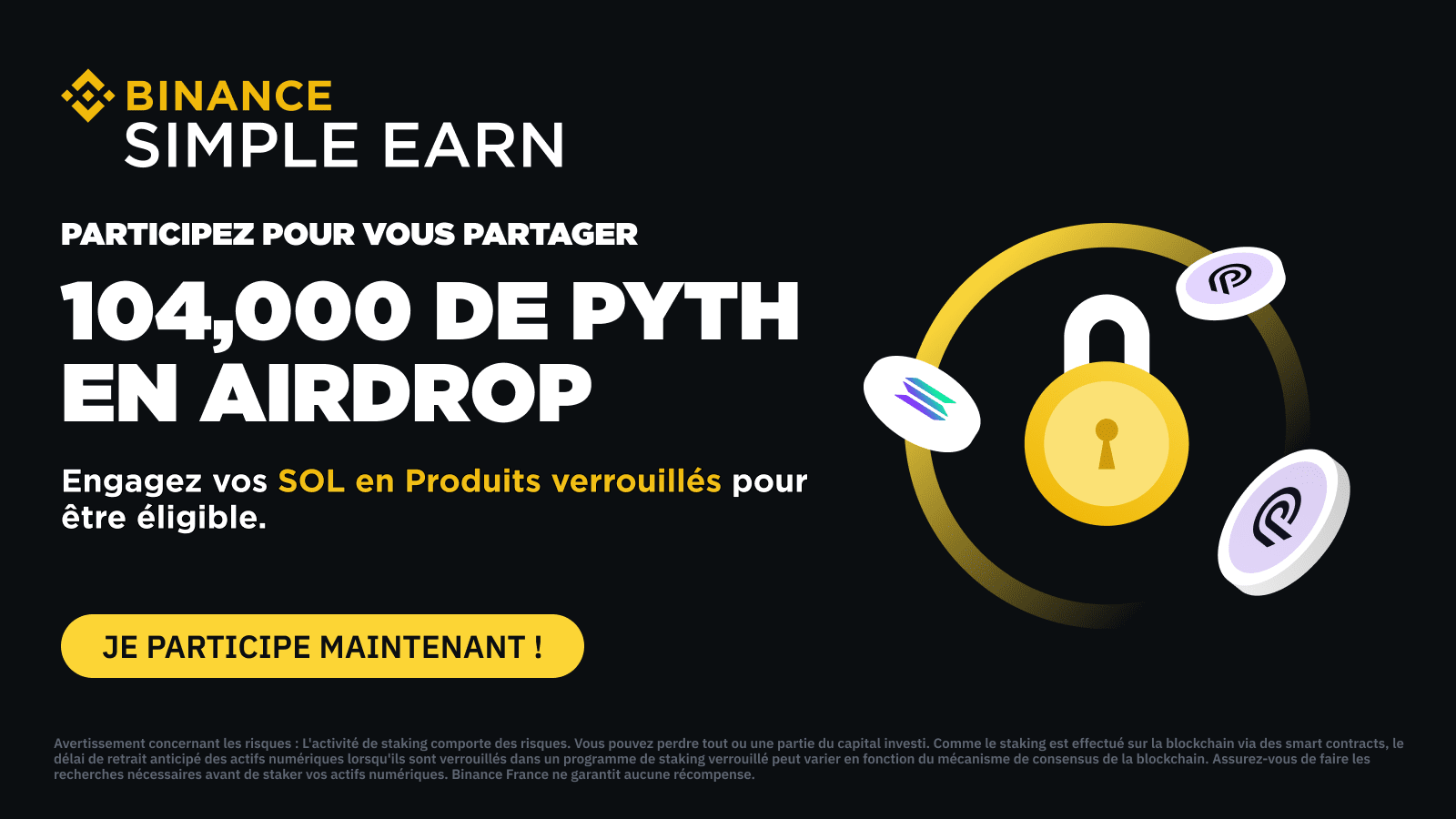 Les récompenses en tokens PYTH seront distribuées par airdrop aux utilisateur(trice)s admissibles avant le 30/05/2024 à 23 h 59 (UTC), sauf avis contraire de Binance. Ils/elles peuvent trouver leurs récompenses via Profil > Actifs > Portefeuille Spot.