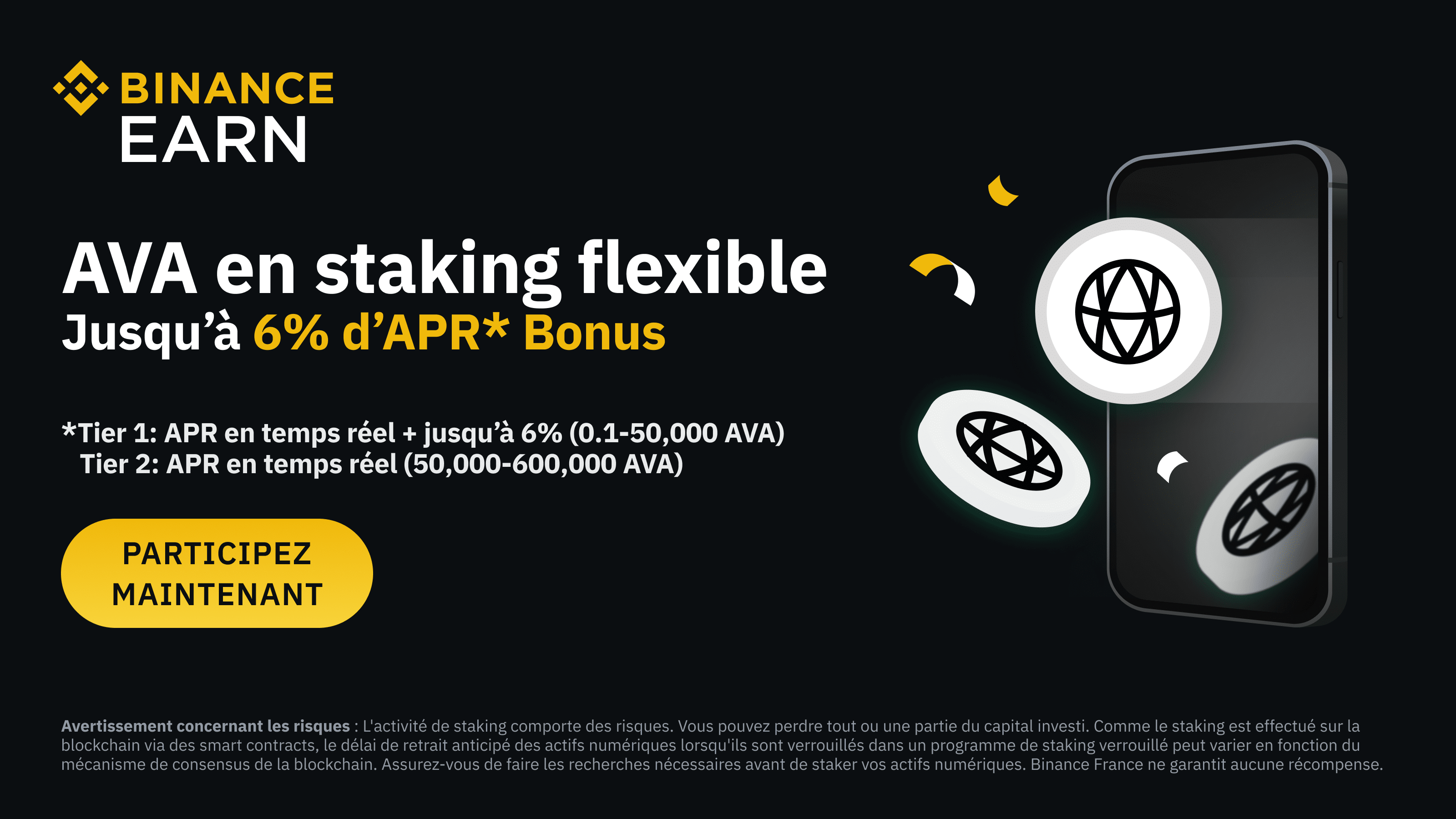 Binance Simple Earn a le plaisir de lancer une promotion pour l’AVA sur les produits flexibles Simple Earn ! Souscrivez des AVA sur les produits flexibles Simple Earn pendant la période de la promotion pour profiter d’un niveau d’APR bonus de 6 %, en plus des récompenses d’APR en temps réel.