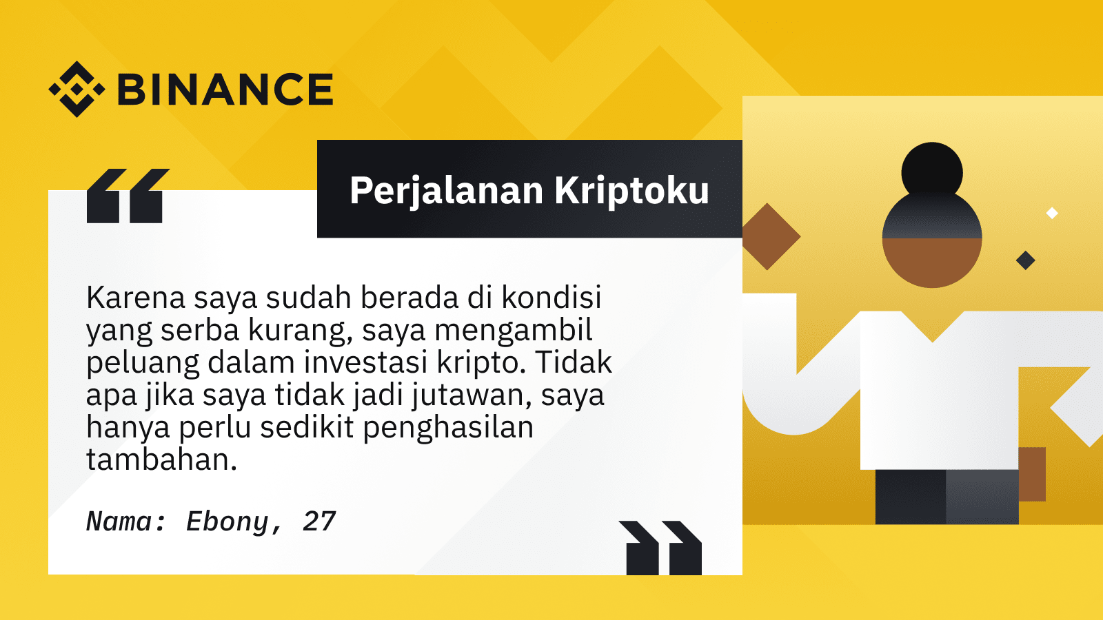 Perjalanan Kriptoku adalah kumpulan cerita inspiratif dari pengguna Binance yang kehidupannya berubah karena kripto. Inilah cerita tentang cara Binance membantu Ebony keluar dari kemiskinan.