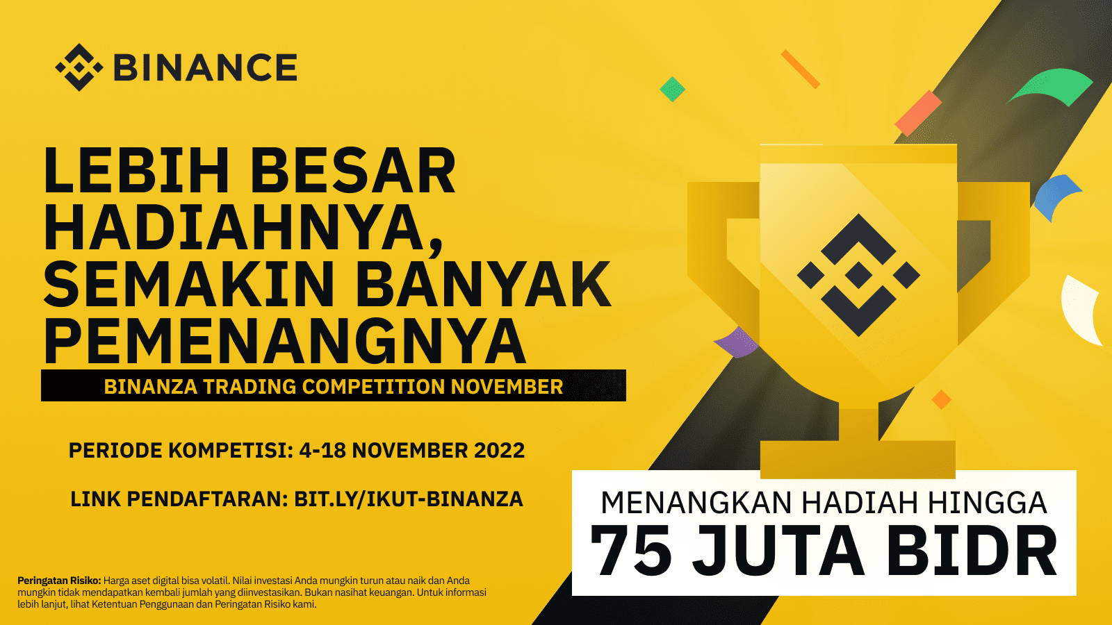 Ikuti festival trading Binanza Trading Competition di Bulan November ini dan dapatkan kesempatan untuk menangkan total hadiah senilai 75,000,000 BIDR!