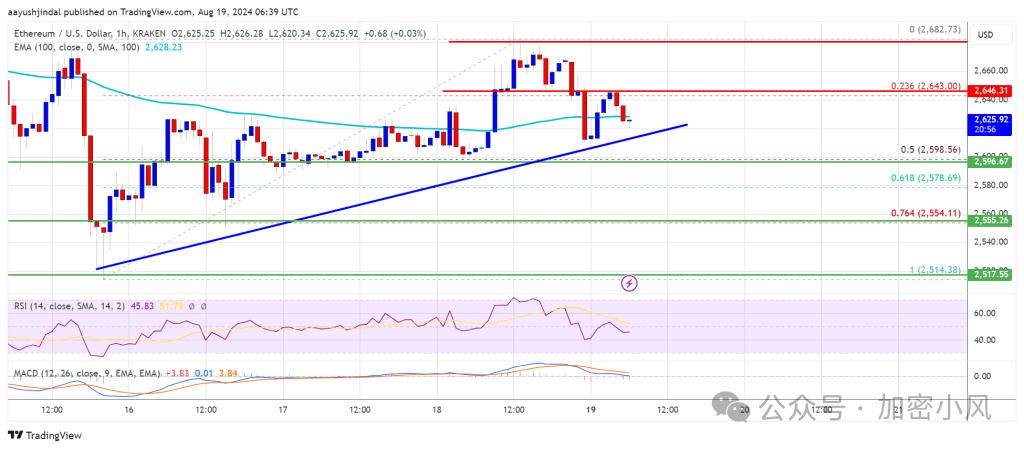 Ada garis tren bullish utama yang terbentuk dengan support di $2,610 pada grafik per jam ETH/USD