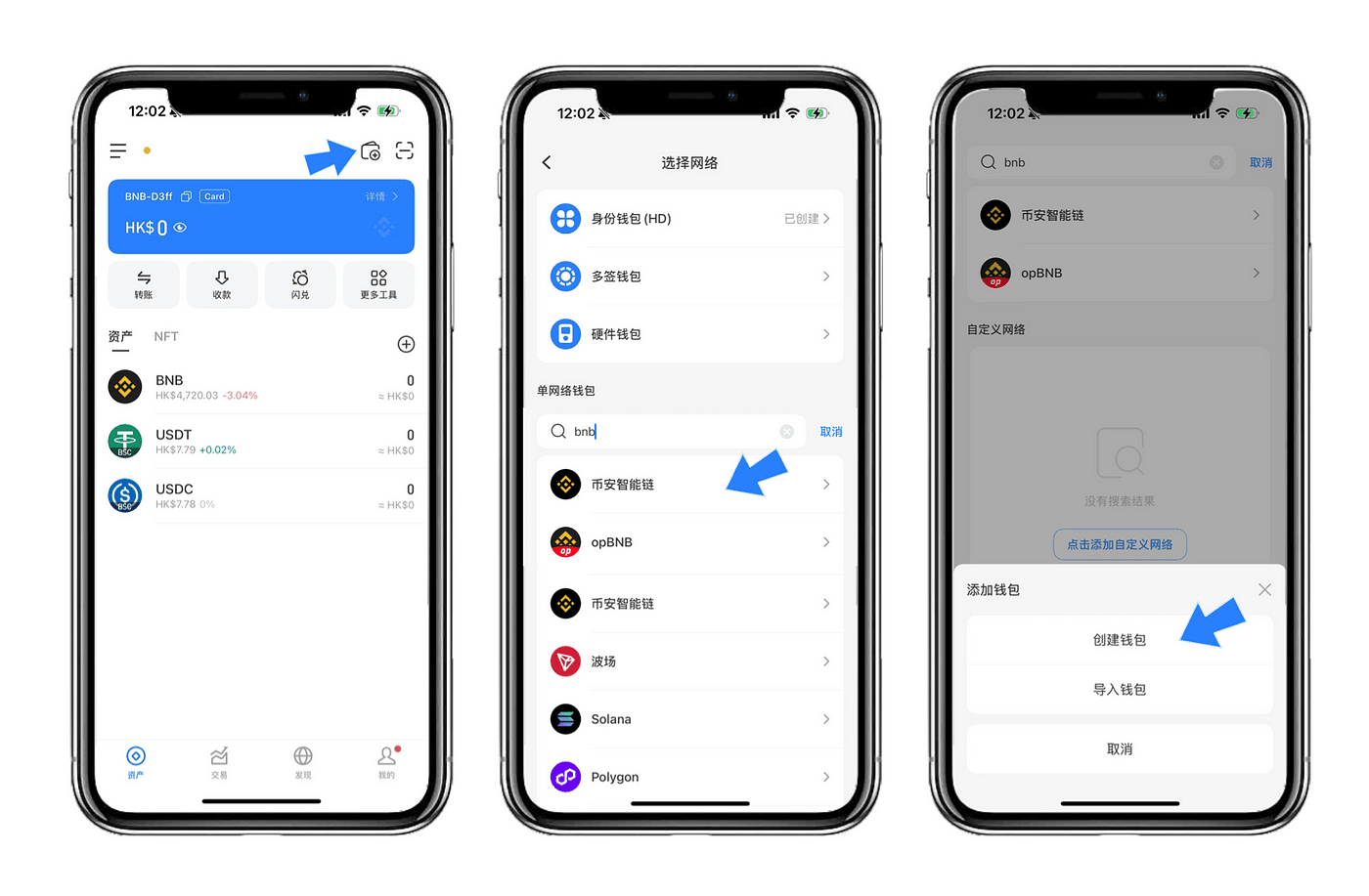 Buka TokenPocket, klik di sudut kanan atasTambahkan dompettombol, pilih jaringan blockchain tujuan dari daftar, seperti BNB (Binance Smart Chain).