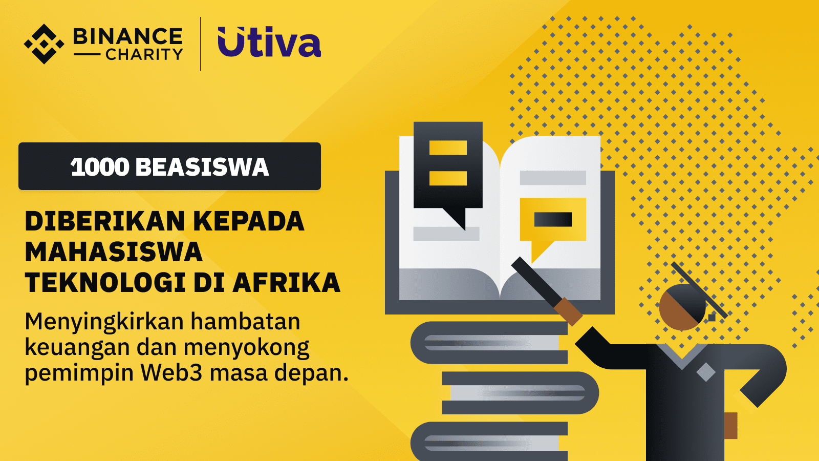 Kami dengan senang hati mengumumkan bahwa Binance Charity melanjutkan kerja bagus kami dengan Utiva untuk membantu membuat perubahan signifikan dalam masyarakat Afrika. Sebagai bagian dari upaya kami untuk mengedukasi 50.000 orang dewasa muda Afrika dan mengatasi pengangguran di benua tersebut, kami merasa terhormat dapat mendukung 1.000 pelajar di 19 negara Afrika melalui beasiswa teknologi kami.