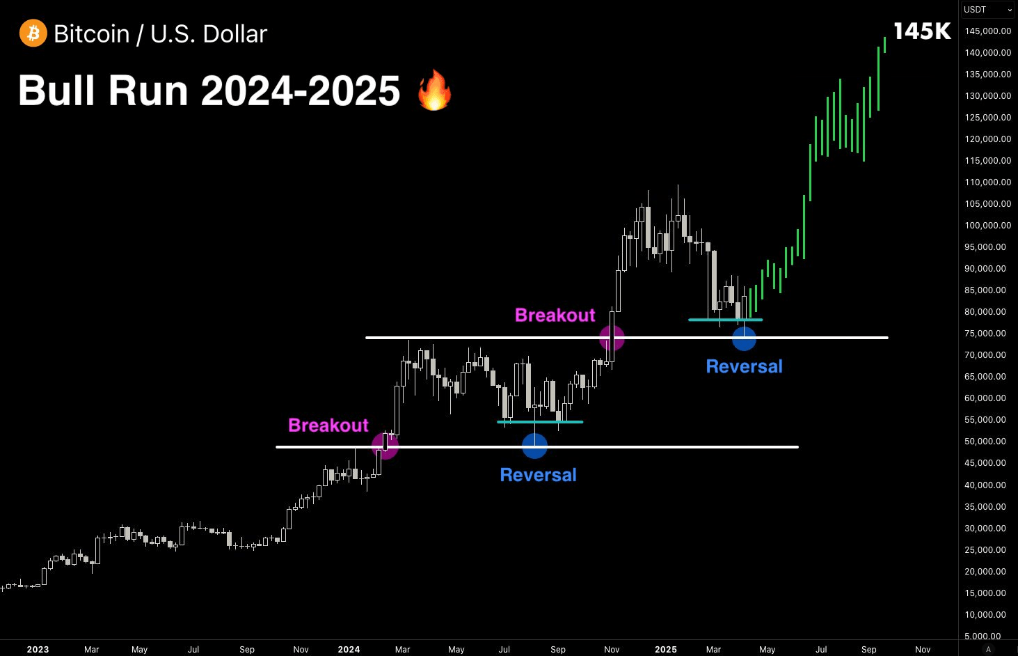 Dengan $BTC sekarang menargetkan $145,000, kita memasuki Fase Markup dari siklus crypto — dan di sinilah altcoin meledak 100x–200x dalam beberapa minggu.