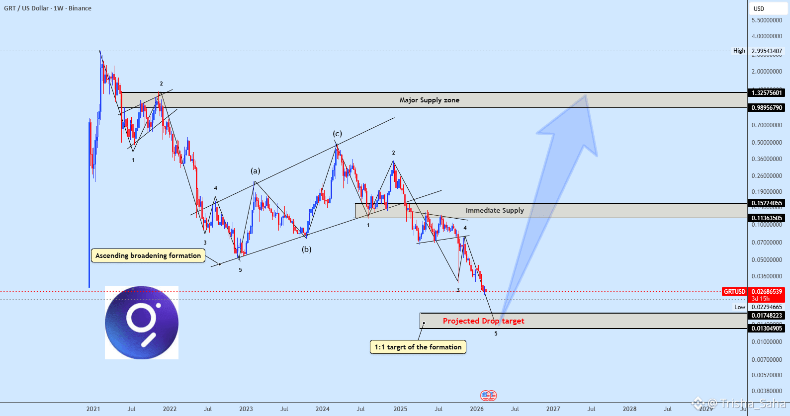 GRT continues to maintain its dominant downtrend, following a confirmed breakdown from the ascending broadening formation.