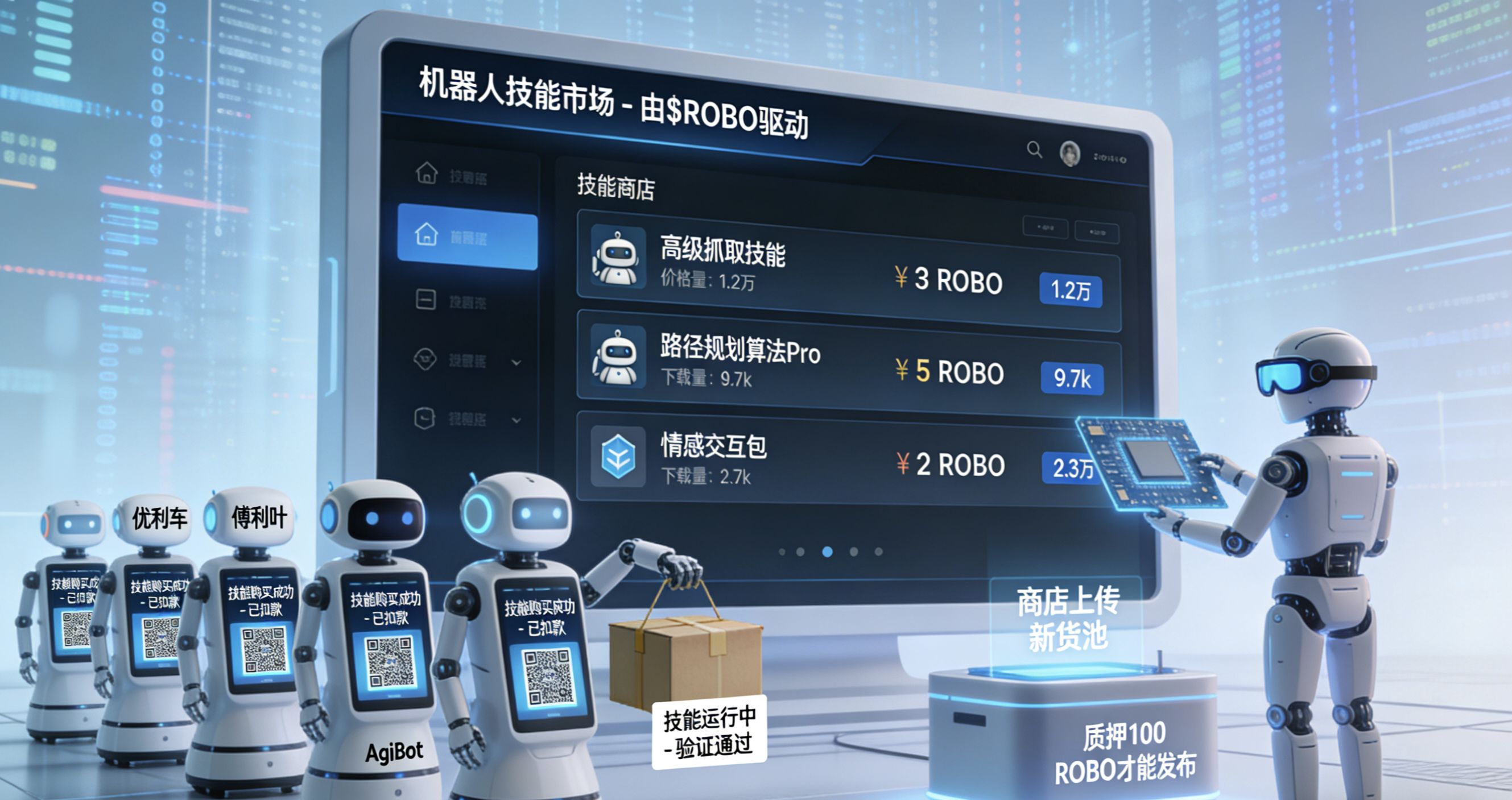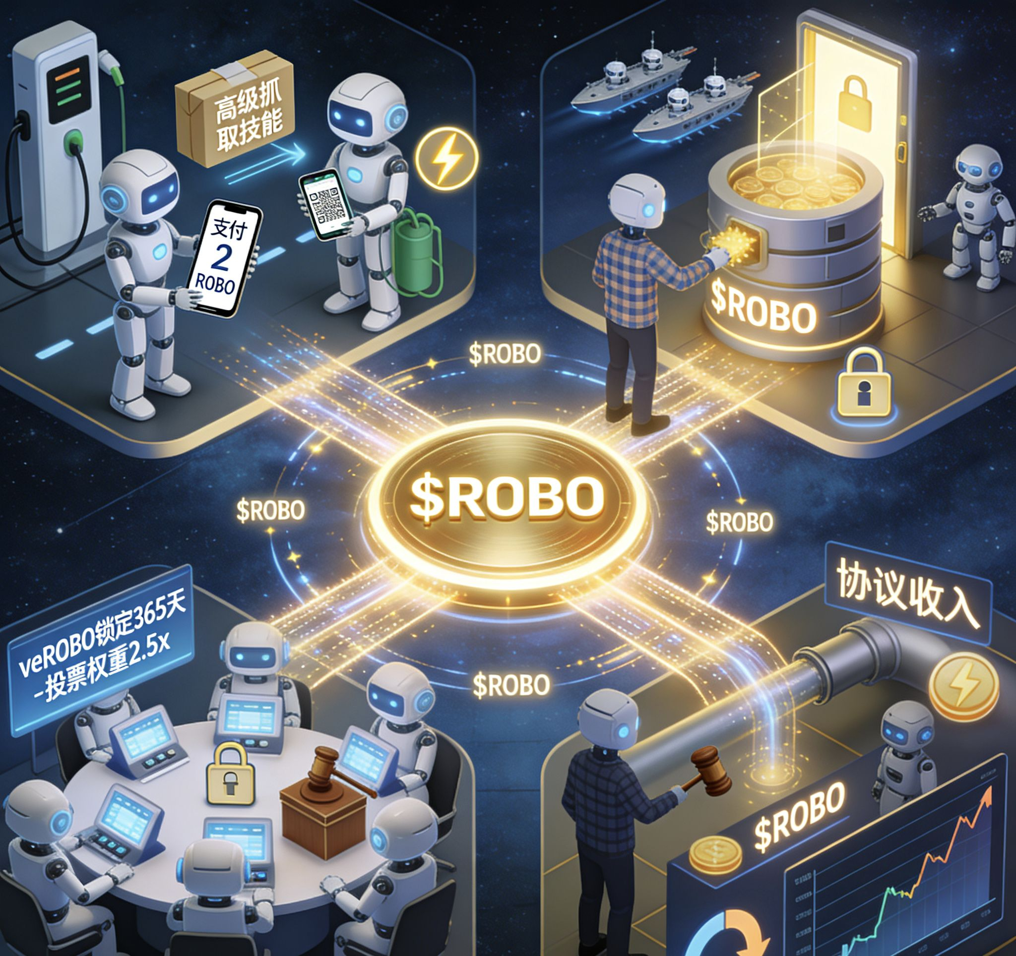 第一,它是支付工具。机器人注册身份、交电费、买技能,全部用 $ROBO 结算 。你想象一下:你家的扫地机器人,如果发现自己路线判断,选择的能力不足,或者还需要加强的话,可以直接向邻居,以及相邻的机器人租用“高级算法(共享)类似的技能”,然后秒付 $ROBO——全程都不用你插手,这是多么爽且高效。