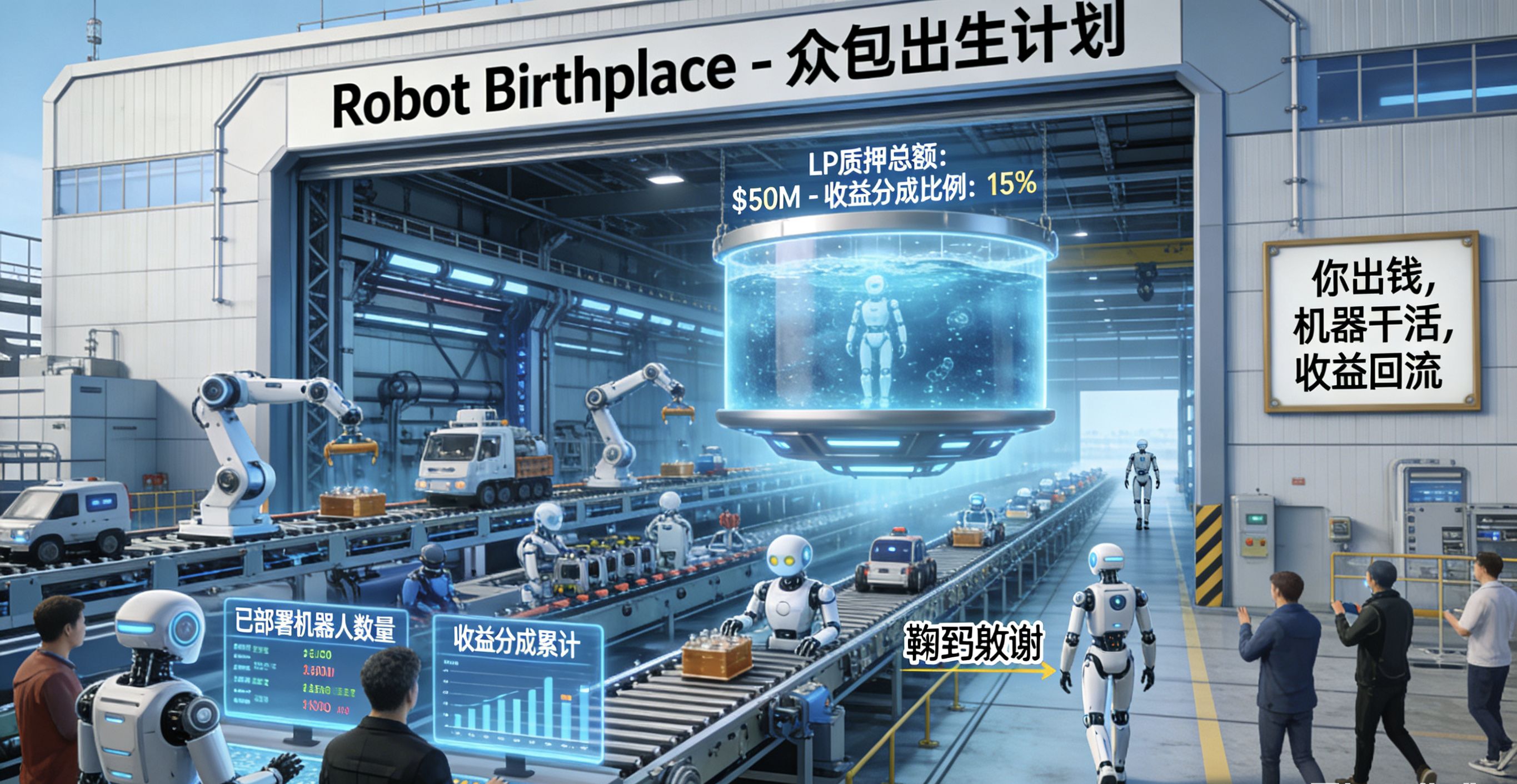 第二,具体部署方向有两个方面。FABRIC 基金会刚宣布两大战略:Robot Birthplace(机器人诞生)通过众包模式,去加速人形机器人在全球范围内去部署,LP 资金也可以支持换取收益分成;Acceleration of Adoption(加速采用)协调机器人生产、共享模拟环境与标准化评估体系 。简单来说:就是你只负责出钱就行了,机器专门负责干活,产生的收益全部回流,这样就形成了完美闭环,完全是未来实际应用的典型。(这不就是我门宣传的内循环?)