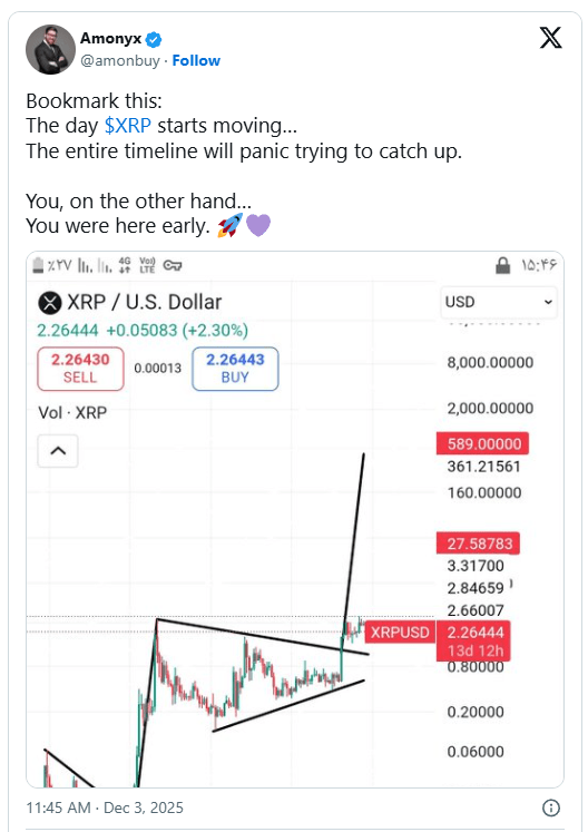 Amonyx (@amonbuy), seorang tokoh kripto terkemuka di X, menyoroti pandangan ini dengan sebuah pos yang menarik perhatian komunitas. Dia memberi tahu pengikutnya untuk menandai grafik yang dia bagikan, dan menambahkan bahwa “Seluruh garis waktu akan panik berusaha untuk mengejar” begitu XRP mulai bergerak.