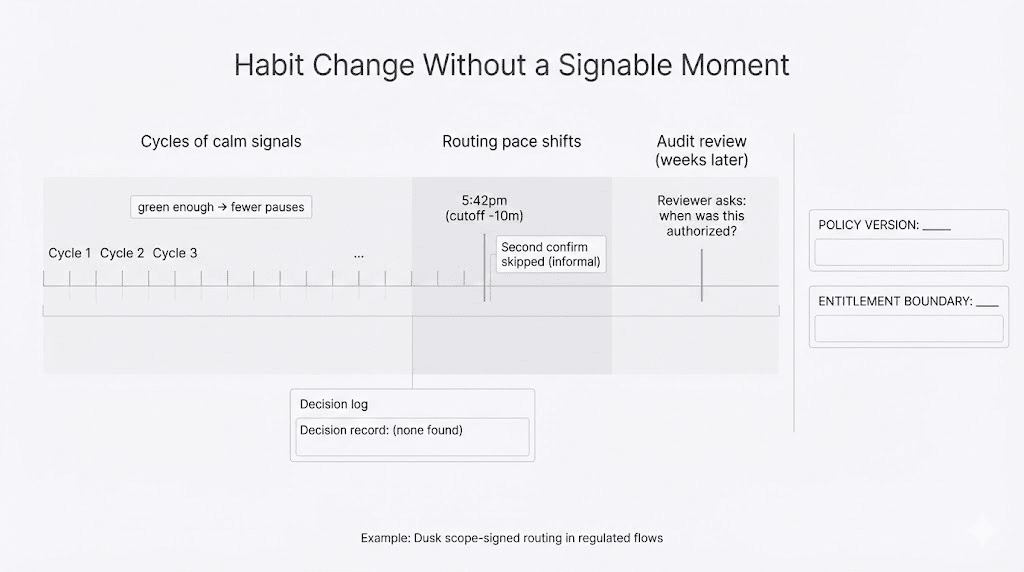 Seorang peninjau menandai itu beberapa minggu kemudian, bukan sebagai kegagalan, tetapi sebagai ketidakcocokan. Rute terlihat berbeda. Batas waktu bergeser dan paparan menutup lebih cepat. Tidak ada tiket yang mengizinkannya. Tidak ada catatan yang menjelaskan mengapa kecepatan berubah. Hanya jejak keputusan yang menunjuk kembali ke permukaan yang sama tenang.... dan garis kosong di mana pengklasifikasi seharusnya berada, kebijakan versi mana yang dianggap berlaku ketika rute berubah dan siapa yang menyetujui bahwa set hak sudah cukup untuk kecepatan baru.
