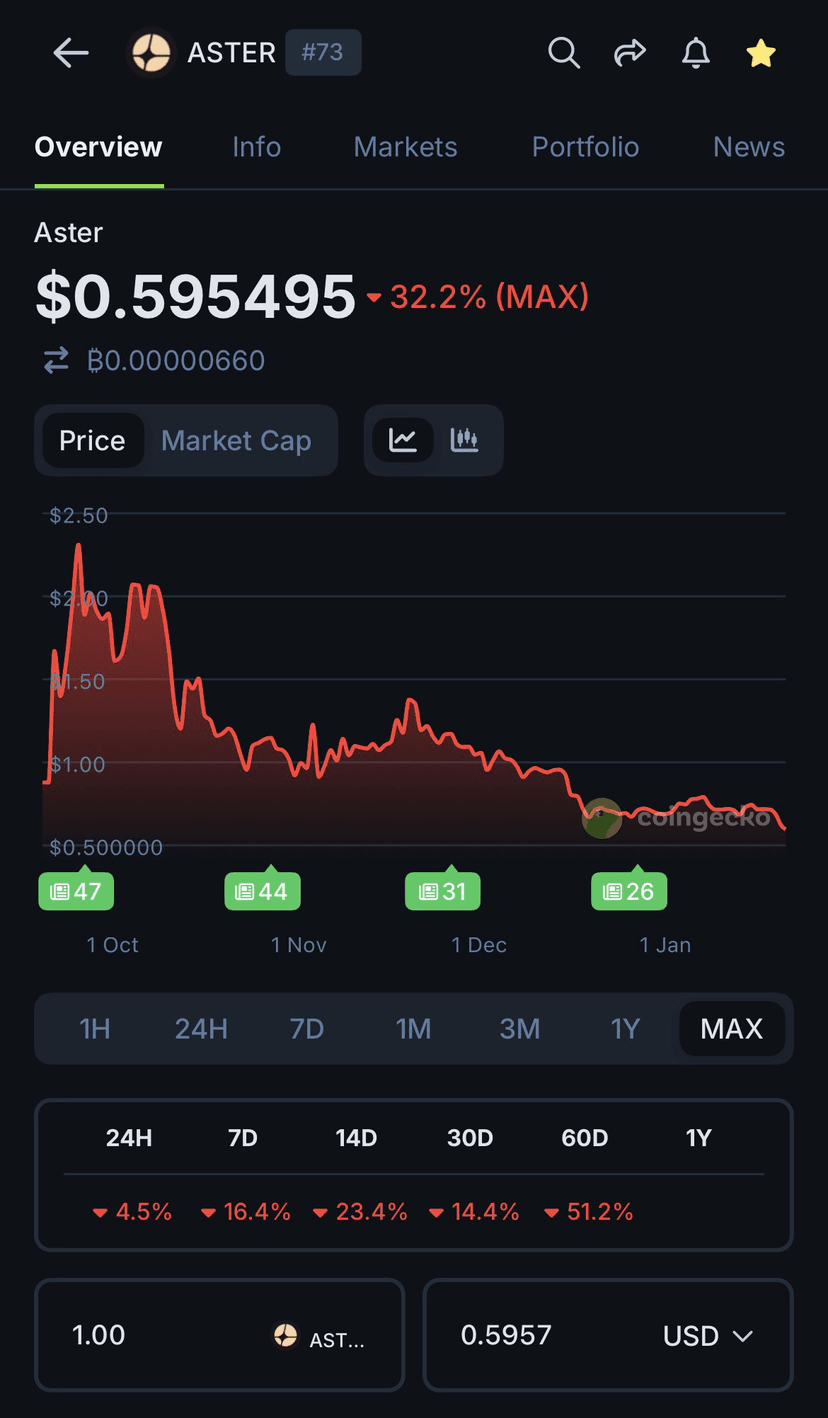 Saya memulai posisi Aster saya pada level harga 0.86 menggunakan 20% dari modal yang telah saya alokasikan. Ketika harga naik menjadi 1.30, saya menjual 30% dari kepemilikan saya untuk mengambil keuntungan dan beralih ke stablecoin. Ketika harga kembali ke 0.86, saya menggunakan semua stablecoin itu untuk masuk kembali, meningkatkan kepemilikan koin saya tanpa mengeluarkan modal baru. Ketika sentimen pasar semakin memburuk dan harga turun menjadi 0.60, saya menambah entri DCA lain menggunakan 10% dari modal cadangan saya. Hasilnya adalah bahwa saya hanya menggunakan 30% dari total modal untuk membangun biaya rata-rata sekitar 0.69, sambil tetap mempertahankan stablecoin untuk skenario yang lebih buruk.