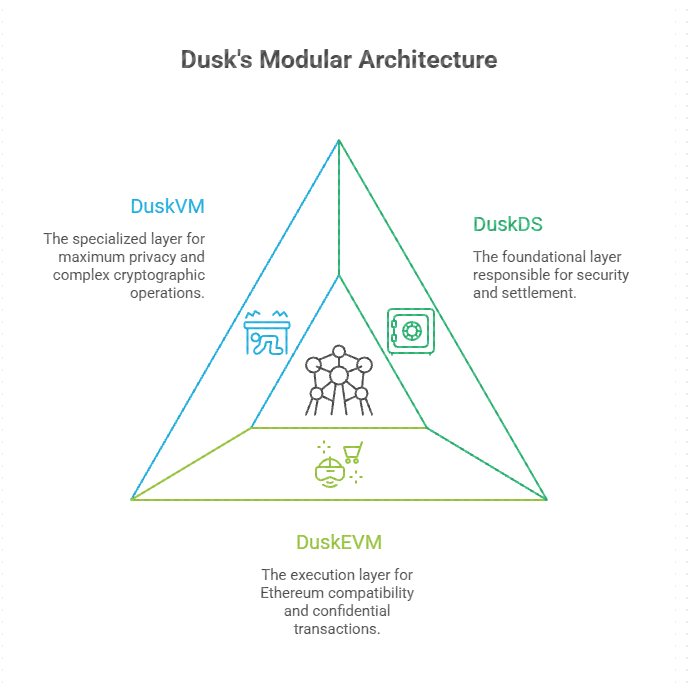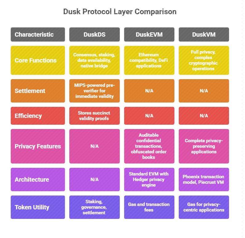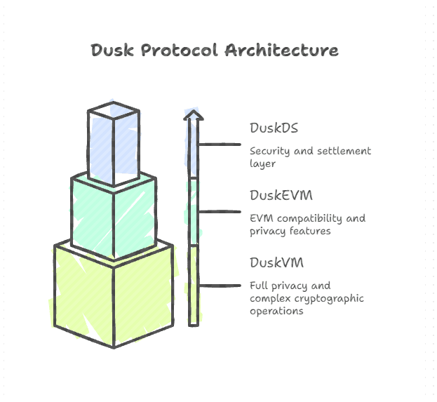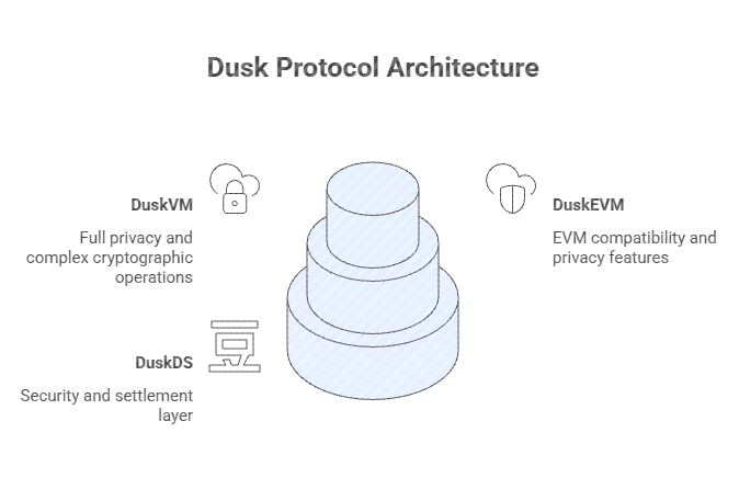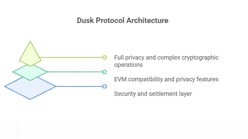 Kebanyakan blockchain mencoba menyelesaikan setiap masalah dalam satu lapisan dan kemudian bertanya-tanya mengapa semuanya menjadi lambat, mahal, atau rusak. Dusk melakukan sesuatu yang kurang populer dan lebih disengaja. Itu membagi protokol menjadi tiga lapisan. Bukan karena terlihat menarik dalam diagram tetapi karena keuangan yang diatur tidak mentolerir jalan pintas.