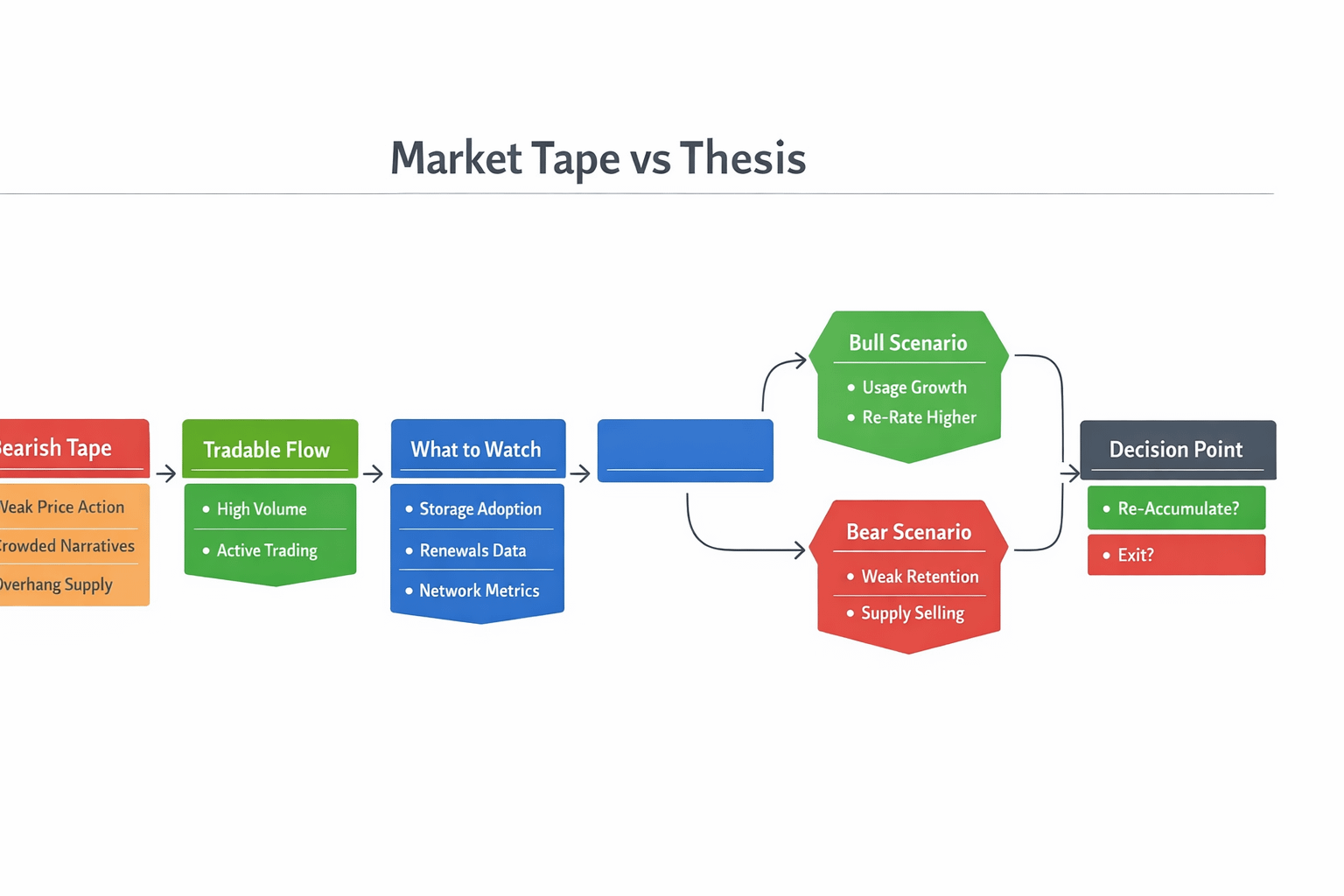 Jika Anda memperdagangkan ini, apa yang sebenarnya akan mengubah pikiran saya ke arah mana pun cukup konkret. Saya ingin melihat daya tarik di sisi jaringan yang sulit dipalsukan: pertumbuhan dalam blob yang disimpan dan total kapasitas yang digunakan, bukti pembaruan (bukan hanya unggahan sekali), set node penyimpanan yang sehat dan stabil, dan tanda bahwa aplikasi mengintegrasikan Walrus sebagai backend penyimpanan default daripada hanya centang kotak pemasaran. Mengenai harga, saya lebih peduli tentang apakah tekanan jual menyusut selama beberapa minggu sementara metrik penggunaan meningkat. Jika penggunaan meningkat dan harga masih tidak bisa menangkap tawaran, itu biasanya berarti dinamika pasokan lebih berat daripada yang diakui orang.