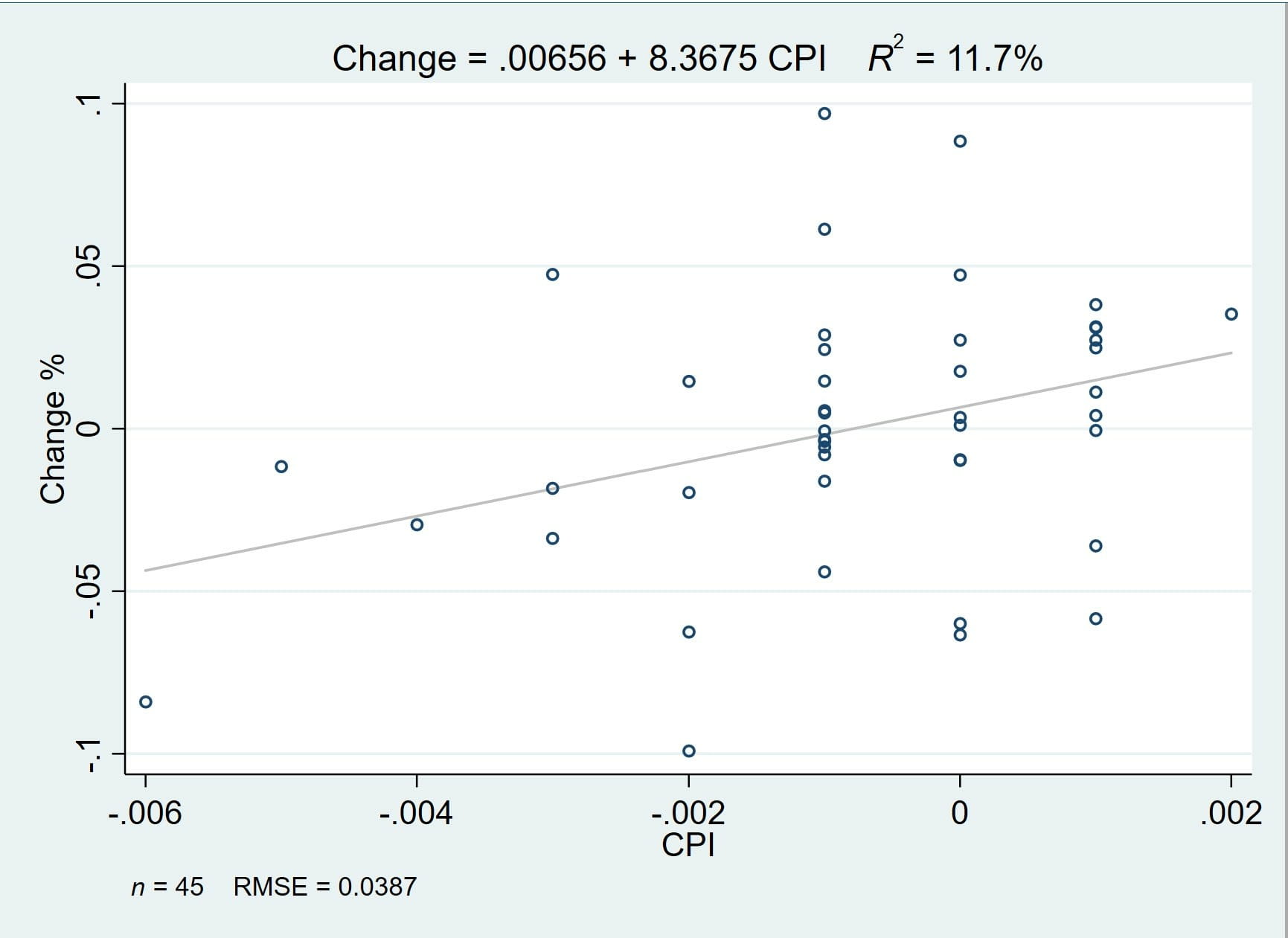 CPI公布日BTC涨跌幅度同市场预测差异具有显著相关性,即实际CPI同预测CPI差异越大,BTC当日涨跌幅越大;