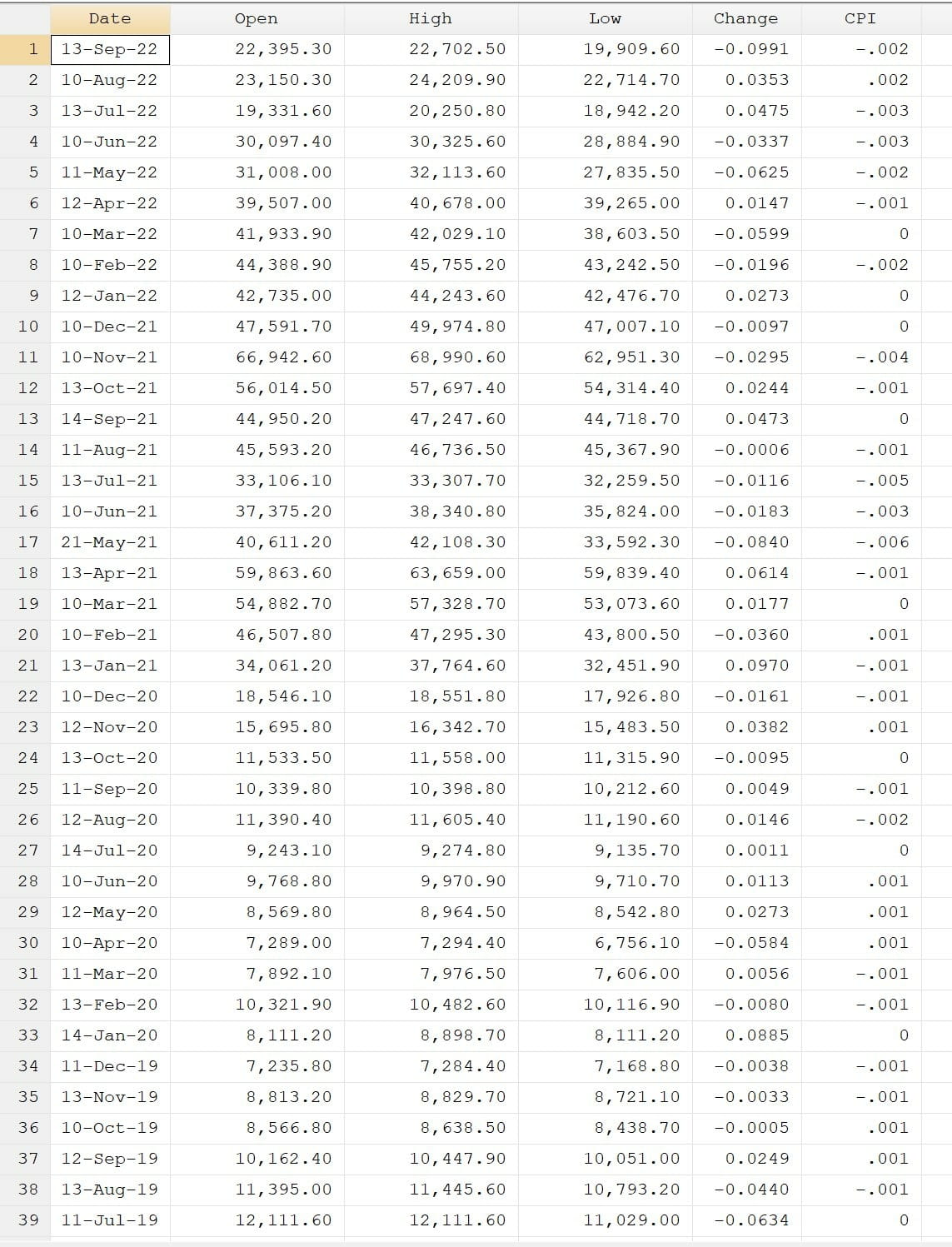 2019年7月11日起到2022年9月13日公布CPI当日BTC的价格共39个观测值;
