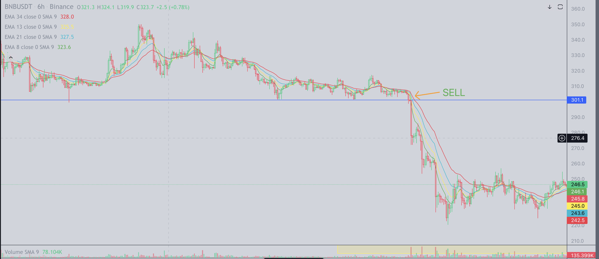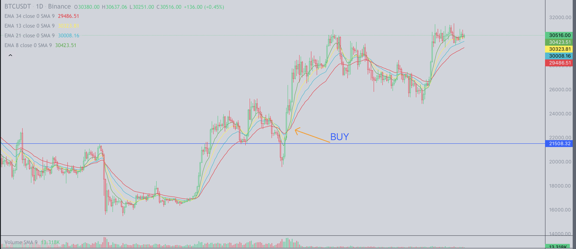Sekarang jika kita ingin menggunakan metode ini dengan sempurna, kita harus menggabungkan indikator ini dengan strategi trading lainnya. Misalnya, jika Anda melihat koin A sedang diuji ulang di support dan persilangan garis EMA menunjukkan indikasi bullish, maka itu mungkin sinyal Beli.