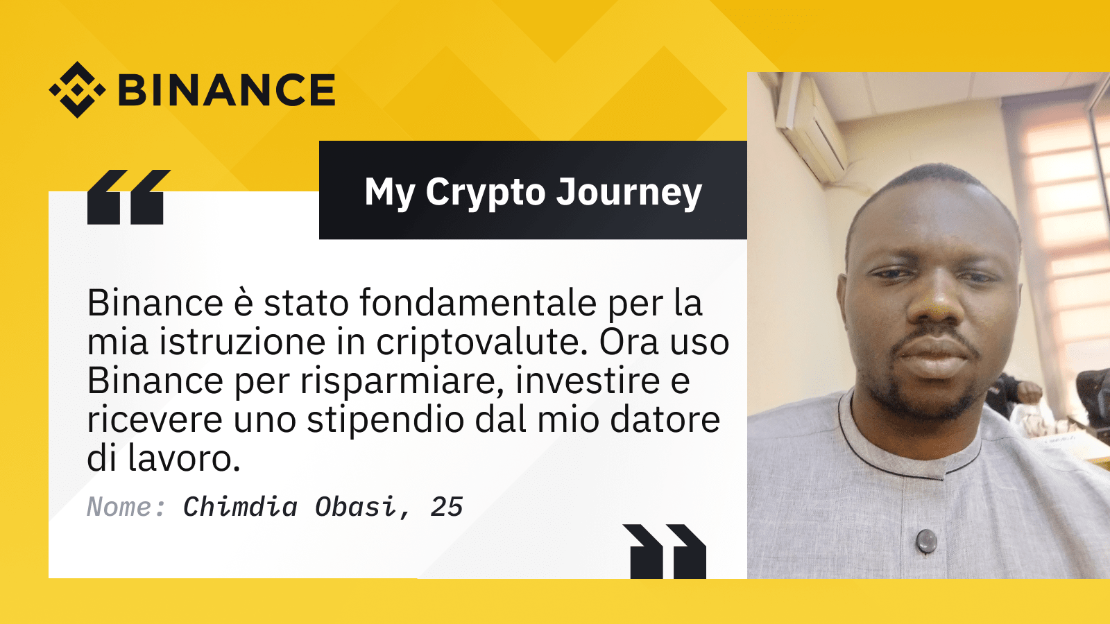 Binance è diventata la soluzione alle difficoltà di gestione finanziarie di Chimdia. Leggi la testimonianza di questa settimana su Il mio viaggio crypto, una raccolta di storie degli utenti le cui vite sono cambiate grazie alla criptovaluta.