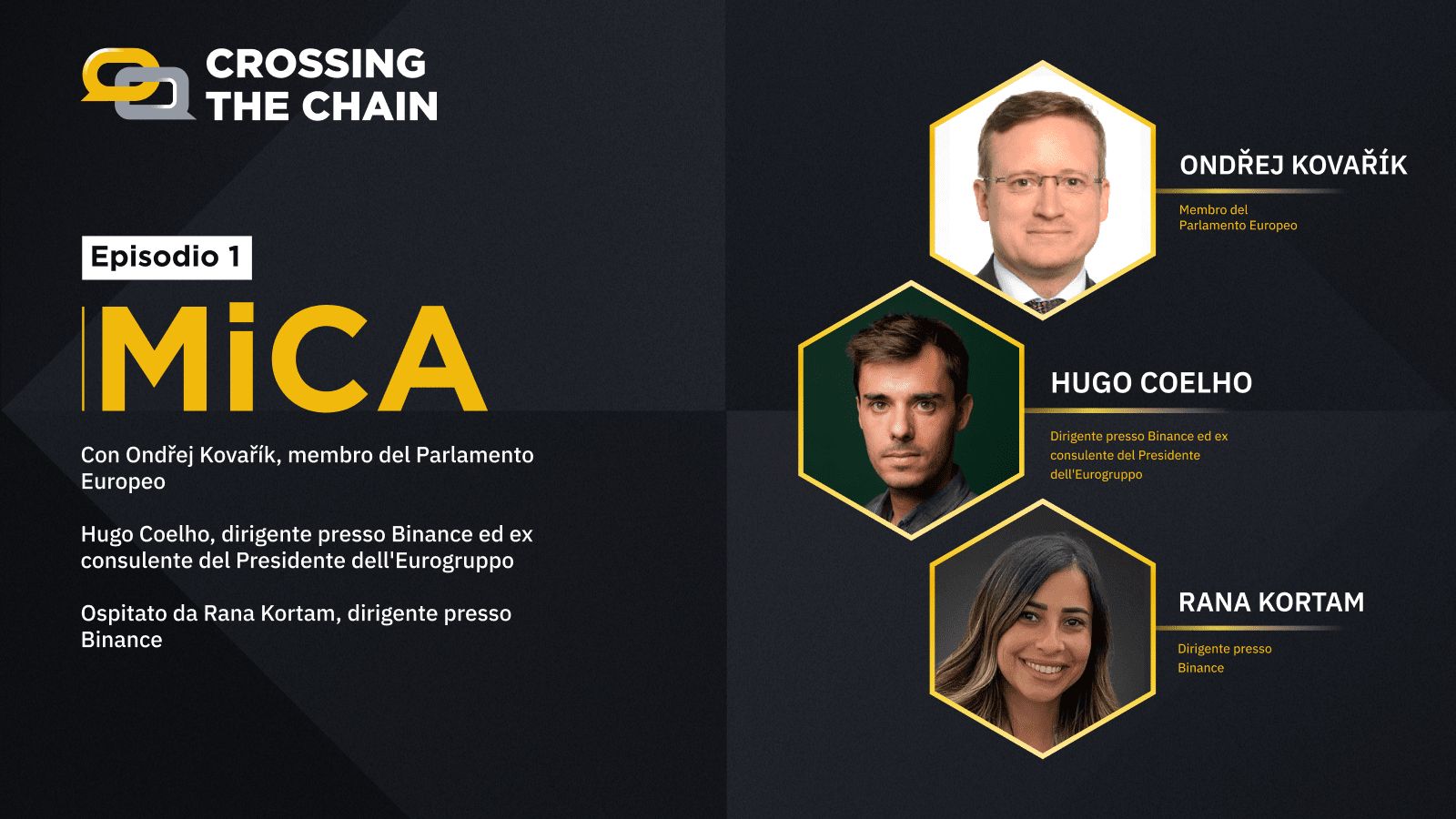 Il primo episodio di Crossing the Chain si è concentrato sul quadro normativo Markets in Crypto-Assets (MiCA) adottato dall'Unione Europea, con la partecipazione di Ondřej Kovařík, membro del Parlamento europeo coinvolto nella creazione della legislazione, e Hugo Coelho, direttore degli affari governativi di Binance.