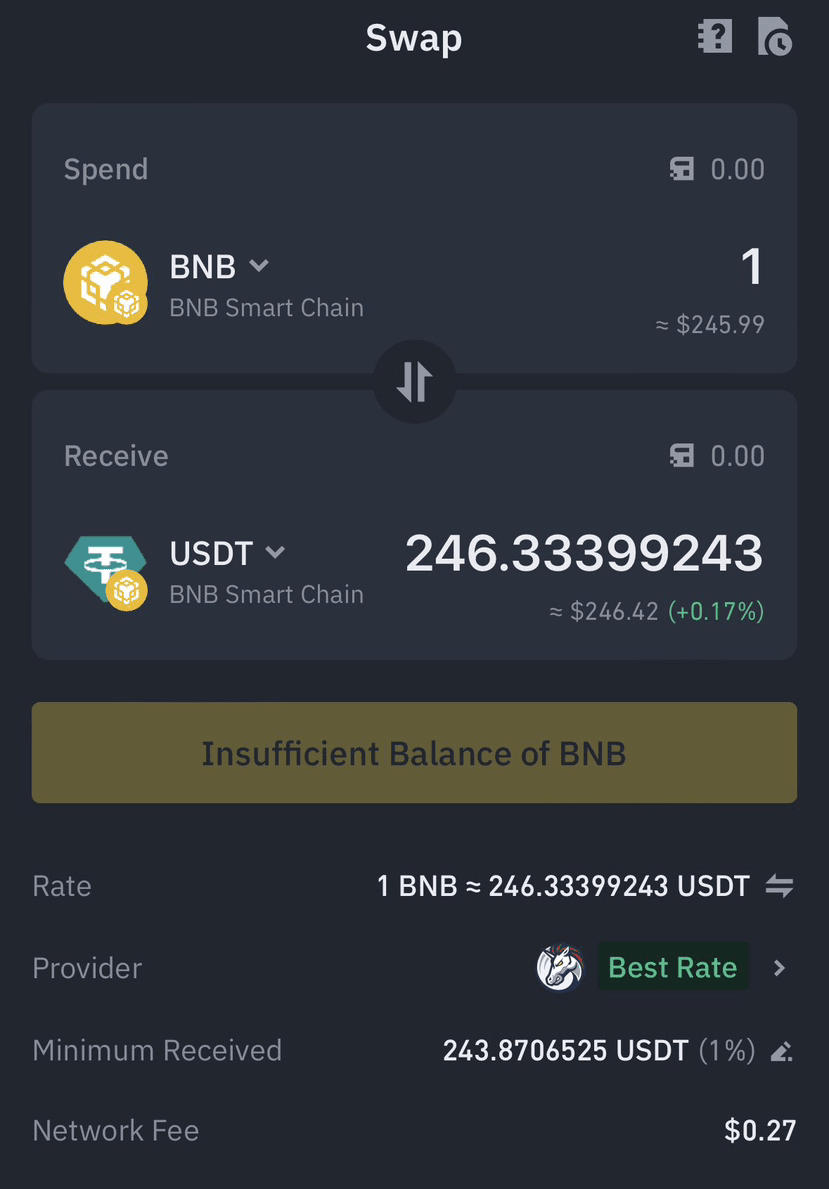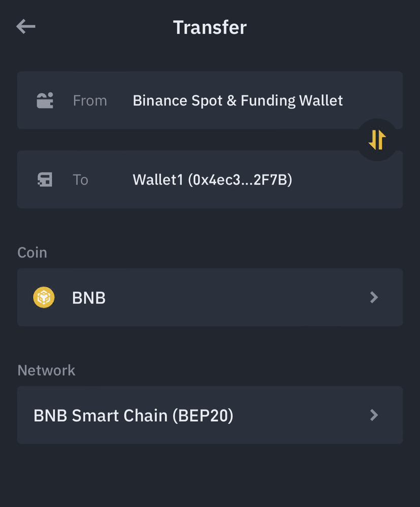 Ha un'atmosfera familiare, proprio come TrustWallet. Trasferire fondi dal tuo portafoglio spot/finanziamento Binance è un gioco da ragazzi e le commissioni sul gas sono minime.