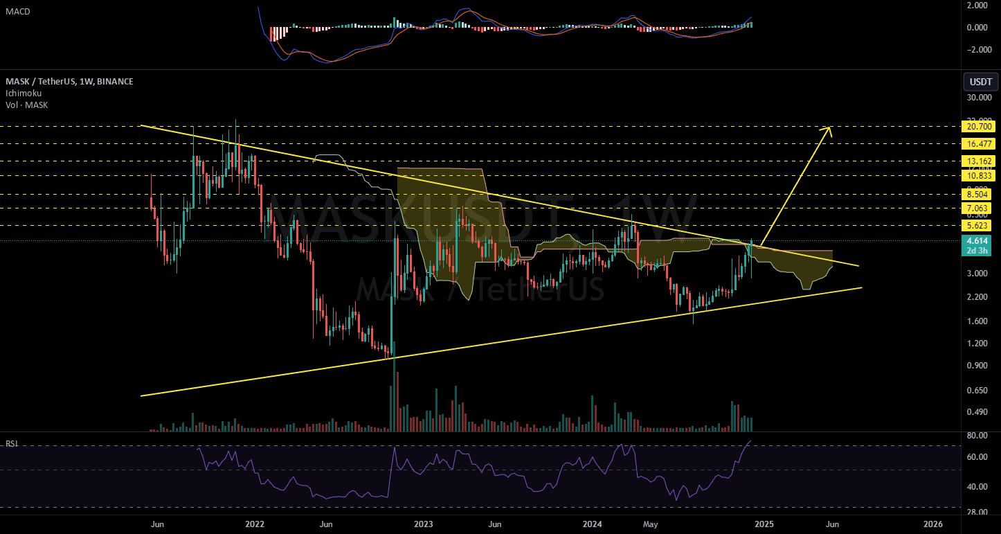 #MASK è uscito dal triangolo simmetrico e dalla nuvola Ichimoku sul grafico settimanale. Se riesce a stabilizzarsi sopra il pattern, gli obiettivi sono: