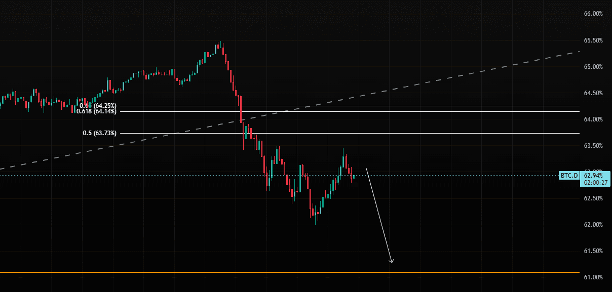 BTC.D sembra buono per gli Altcoins qui. Dovrebbe scendere al suo livello di Fib inferiore.